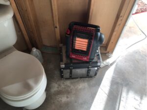 …since the bedroom heater is out of action I have an embarrassment of propane with no other assigned purpose. Nothing stopped me from bringing one of those bottles to the Cave and expending most of it into the bathroom with the door closed. And in the fullness of time…