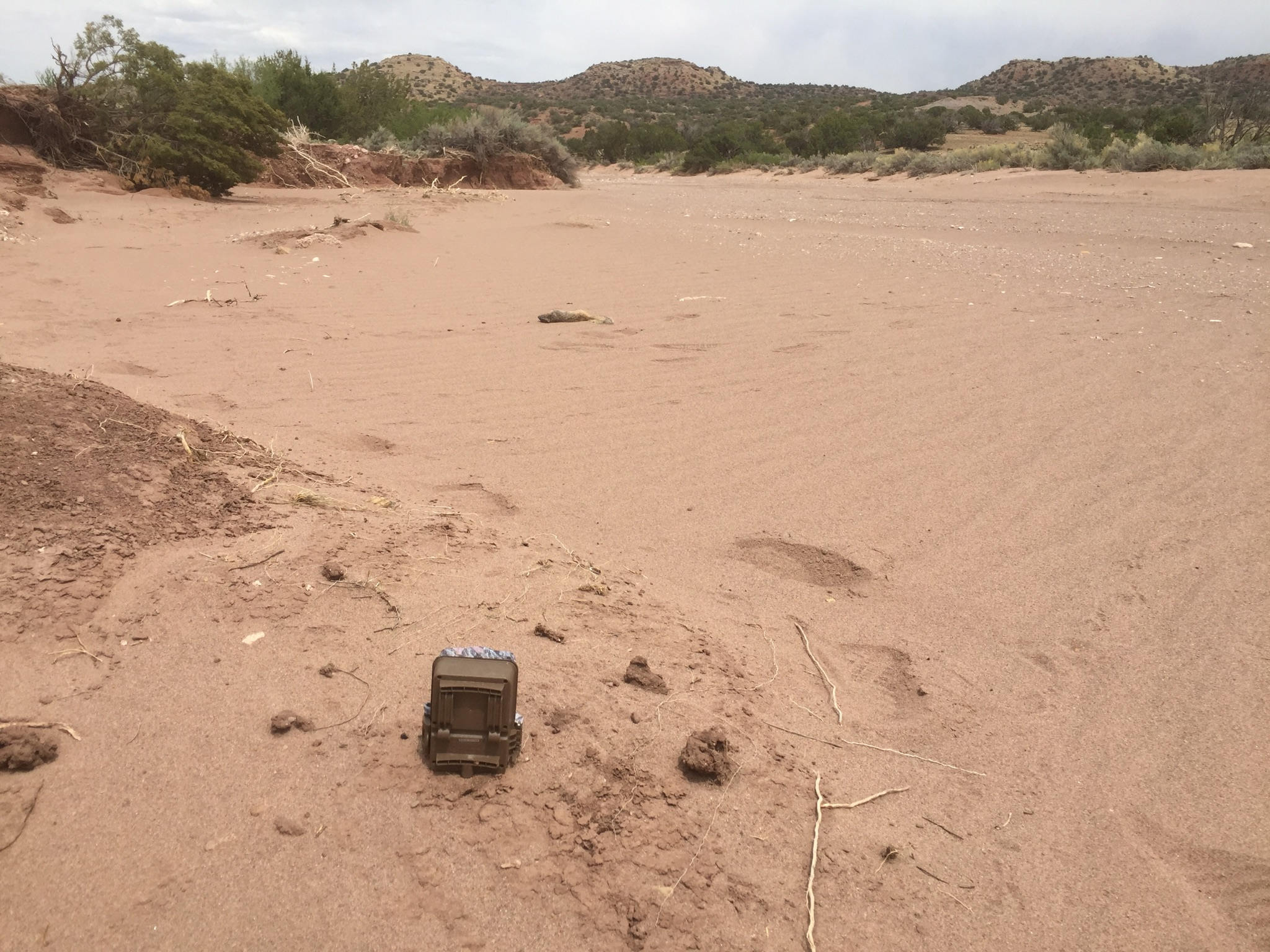 So I took the second squirrel (small male, possibly immature) flying into the wash, then set the game camera up to watch where it landed.