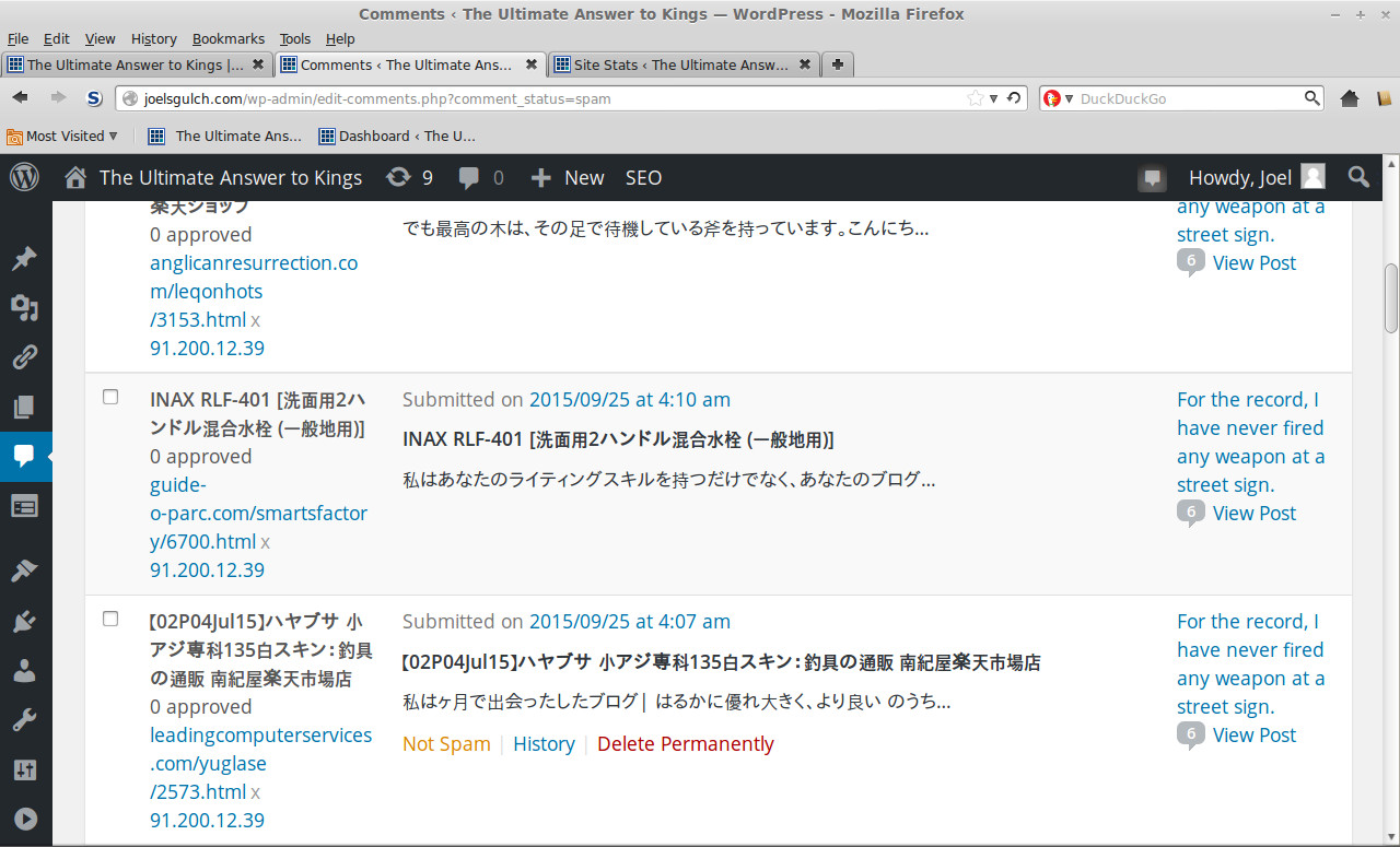 52 of the damned things this morning, all in some alien script so they’re not even entertaining. And even that wouldn’t have been so bad except lately almost 50% of the blasted offerings make it past the spam locker and need to be wormed out of one old post it keeps hitting.