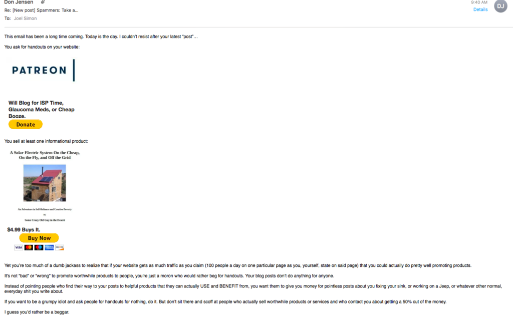 Yet, when someone like me, someone who has a legitimate product that helps thousands of people a year, offers to partner with him so that he can make good money and not have to resort to begging for money like a loser, he acts like a rude jackass and cries that I am “spamming his email”.