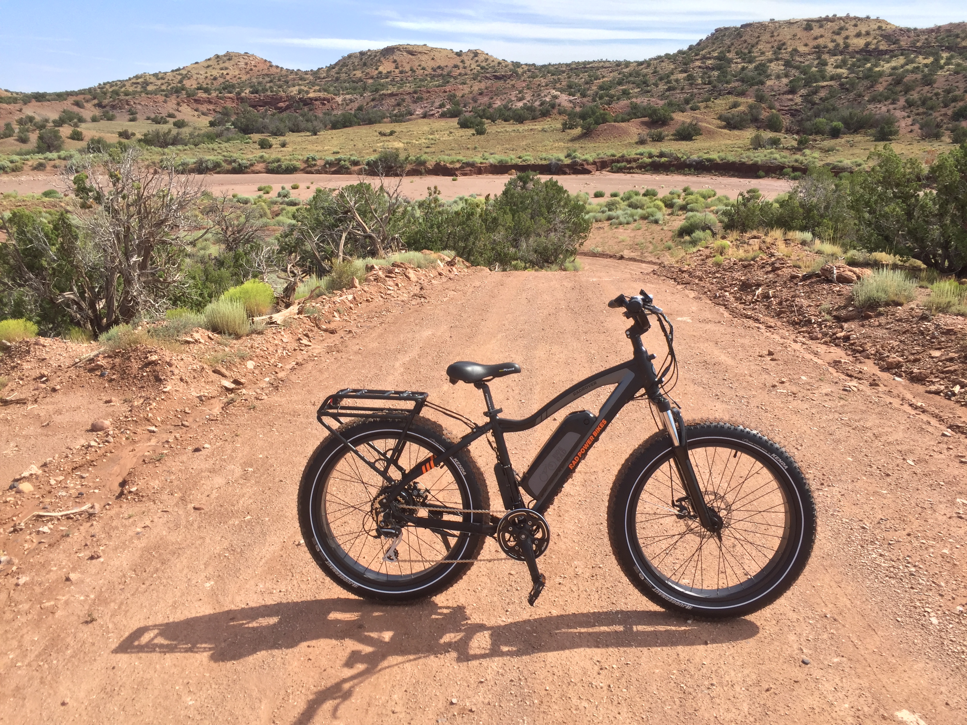 It hardly seems to notice the more moderate hills. Climbing the steep hill coming away from the South wash the motor required quite a lot of help and I frankly doubt I will be able to pedal the hill away from Landlady’s house at all – though I haven’t tried it yet because going down that hill on a bicycle is not something I want to do without a helmet and I neglected to pull my skateboard helmet out of the Jeep kit*. That’s the steepest local hill I know. Before the bulldozer and grader made a road there it was basically a short cliff.