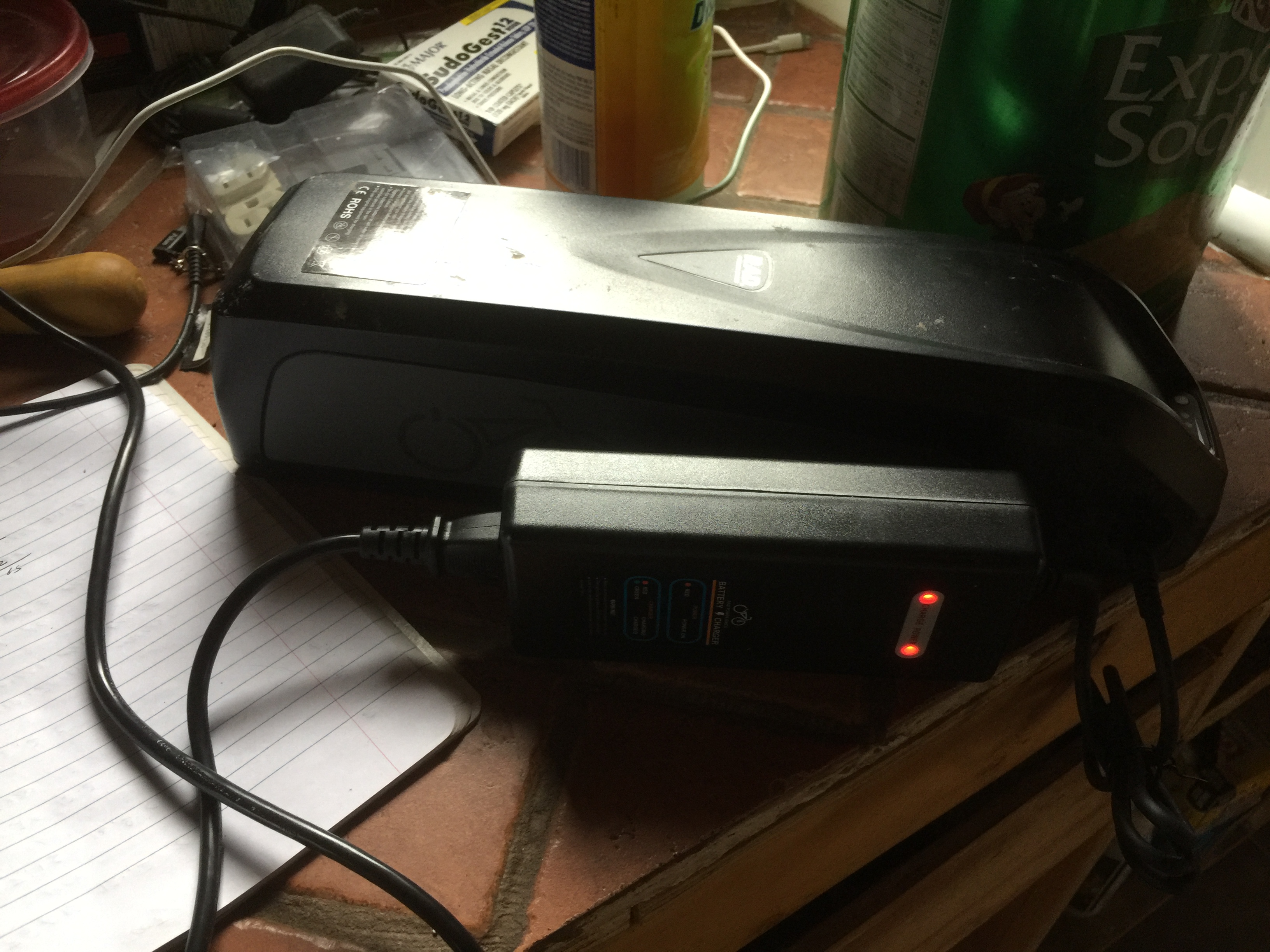 Since it seemed likely to rain yesterday evening and today, I brought the bike’s battery and charger back to the Lair with me. I don’t expect this to be regular practice since I’m currently storing the bike in Ian’s Cave and he’s got lots of unused juice, but the manual is almost ominously adamant about not leaving the battery plugged into the charger longer than necessary and it doesn’t look as though I’ll want to be doing a lot of extra back-and-forthing today.
