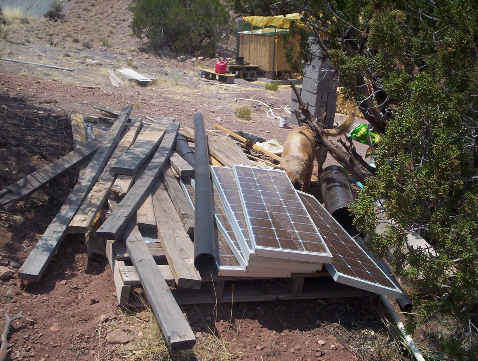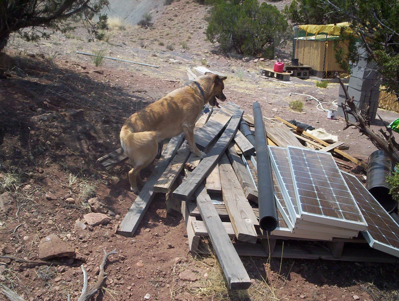 What you can’t see or hear is an extremely loud and frustrated Little Bear, constrained by his cable. If I let him go he wouldn’t just knock my stuff over; he’d shred it. I just got the cedar panels stacked back up under the Lair after the last Rat War.