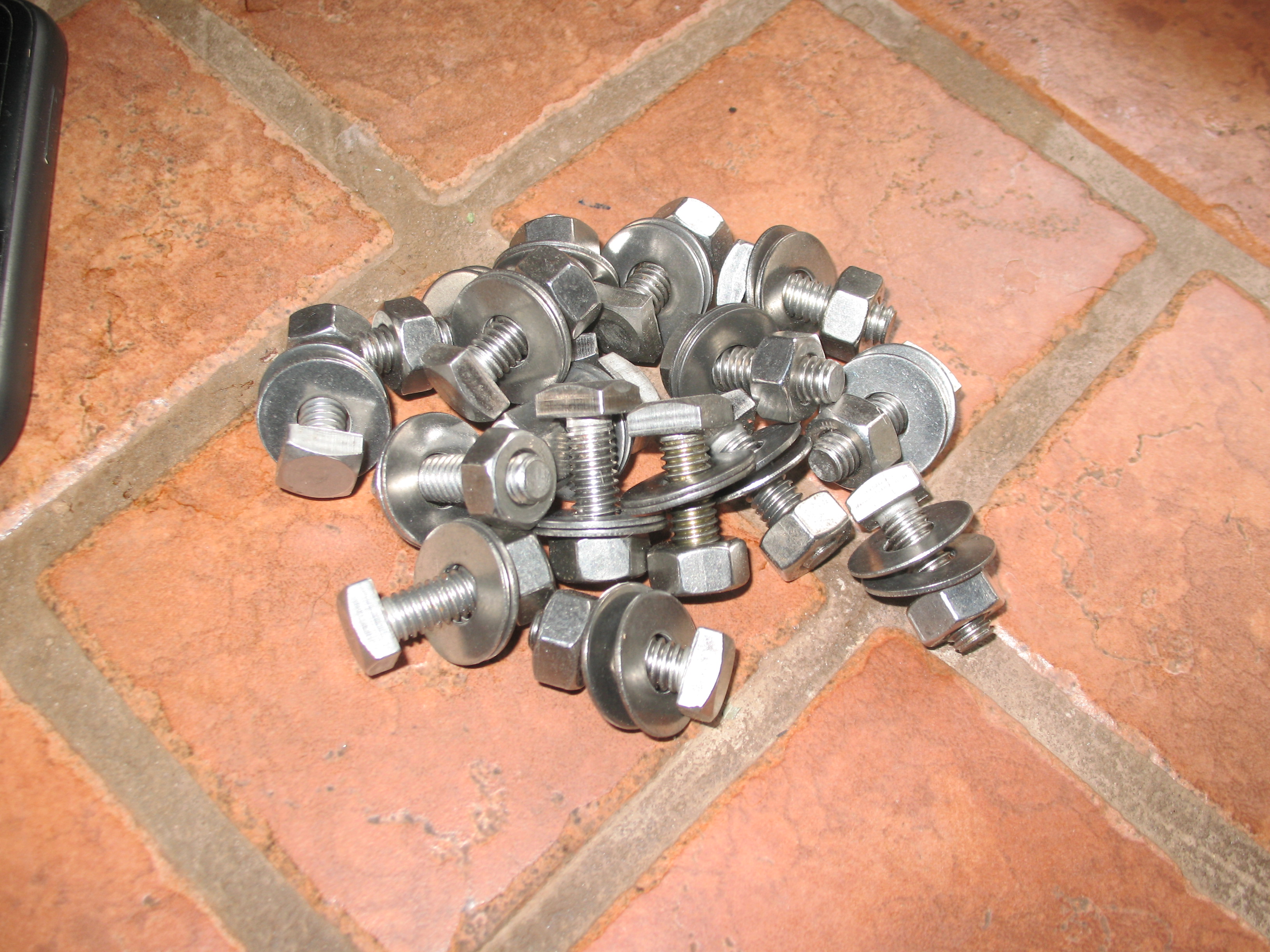 That is sixteen stainless steel 5/16″ bolts, a parting gift yesterday from Weekender Neighbor S. I’ve been renewing Landlady’s battery connections, and complained to him that her batteries are the only ones in the Gulch that routinely turn connector bolts into puddles of foamy brown goo. I don’t know why this happens, and neither does he but I can try these stainless bolts to see if they’ll resist the destructive corrosion. It means doing some work twice, since I’m already done with the top tier, but replacing the bolts is the easy part. Cleaning up the goo and sanding the connections clean is the hard part.