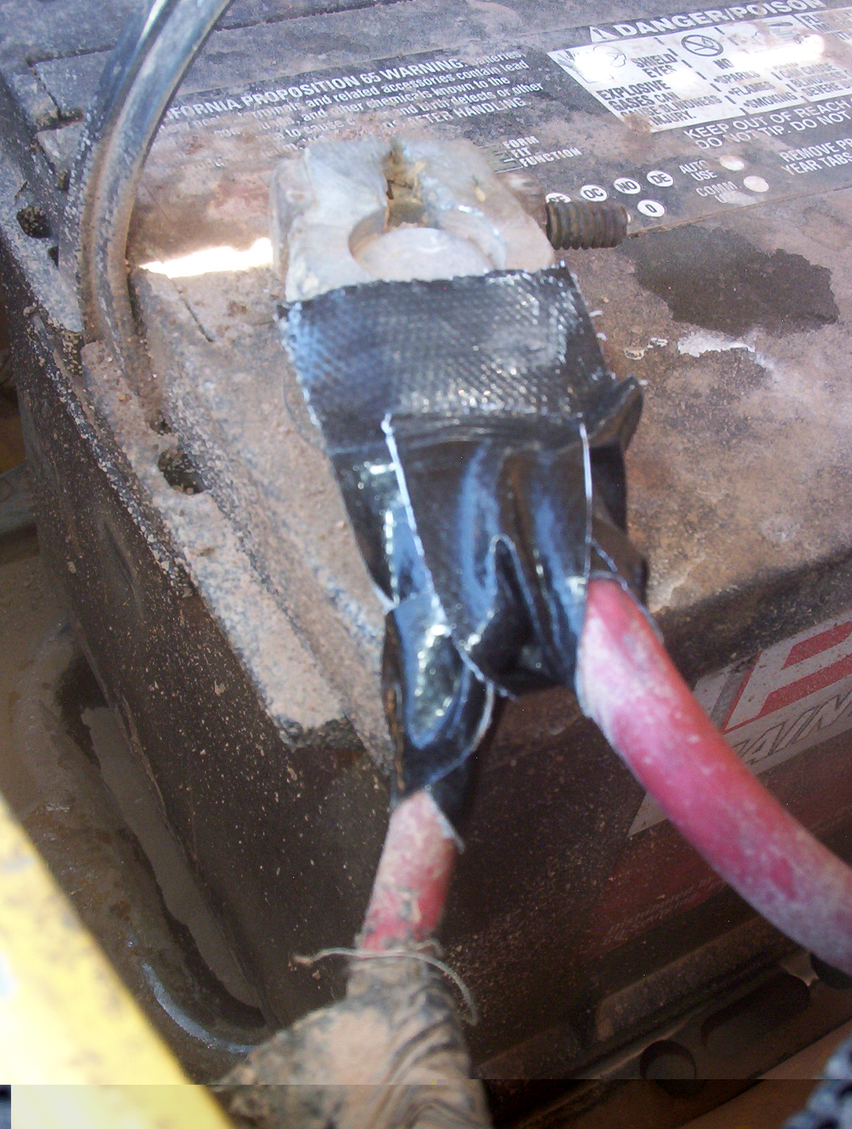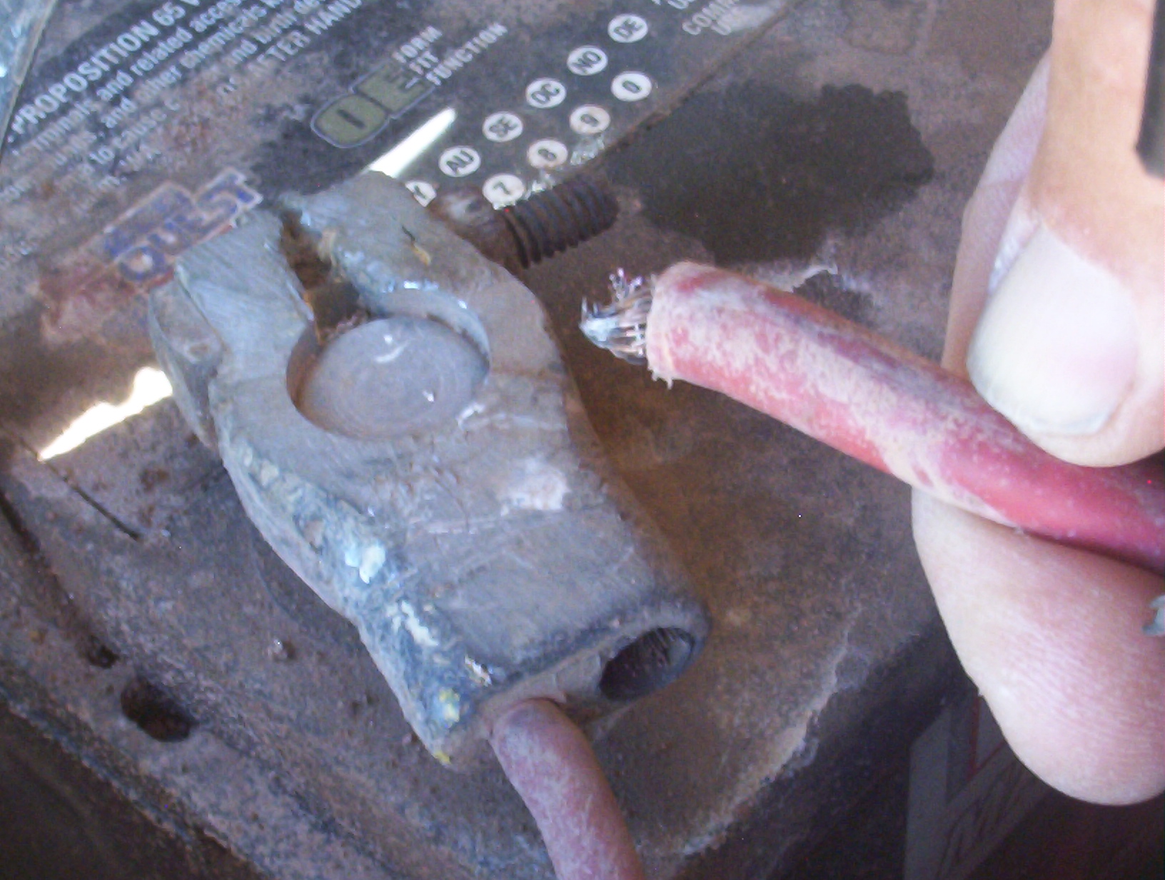 Uh oh. Starter cable fatigued apart right at the battery clamp. Suppose I could actually fix this with a torch and some solder. Don’t happen to have any of those things out in the boonies, though.