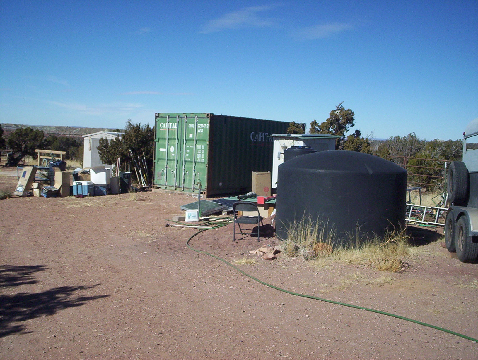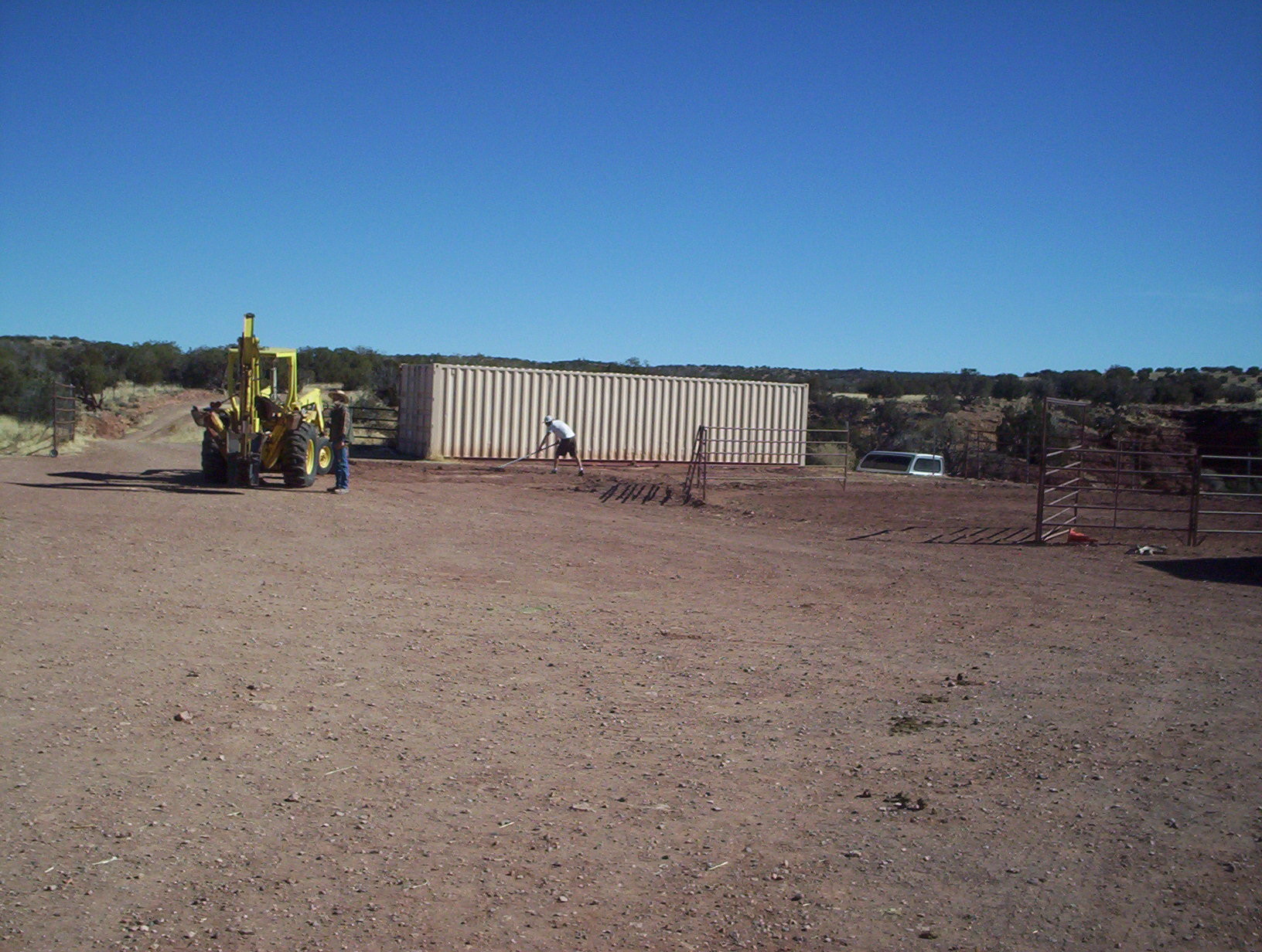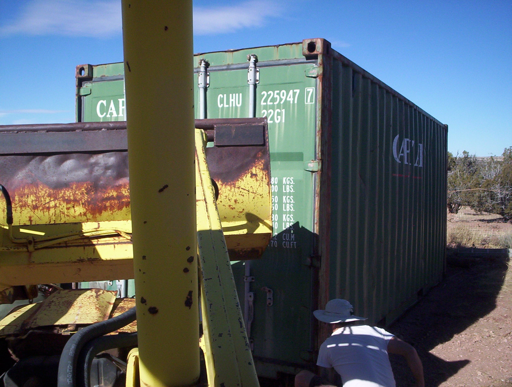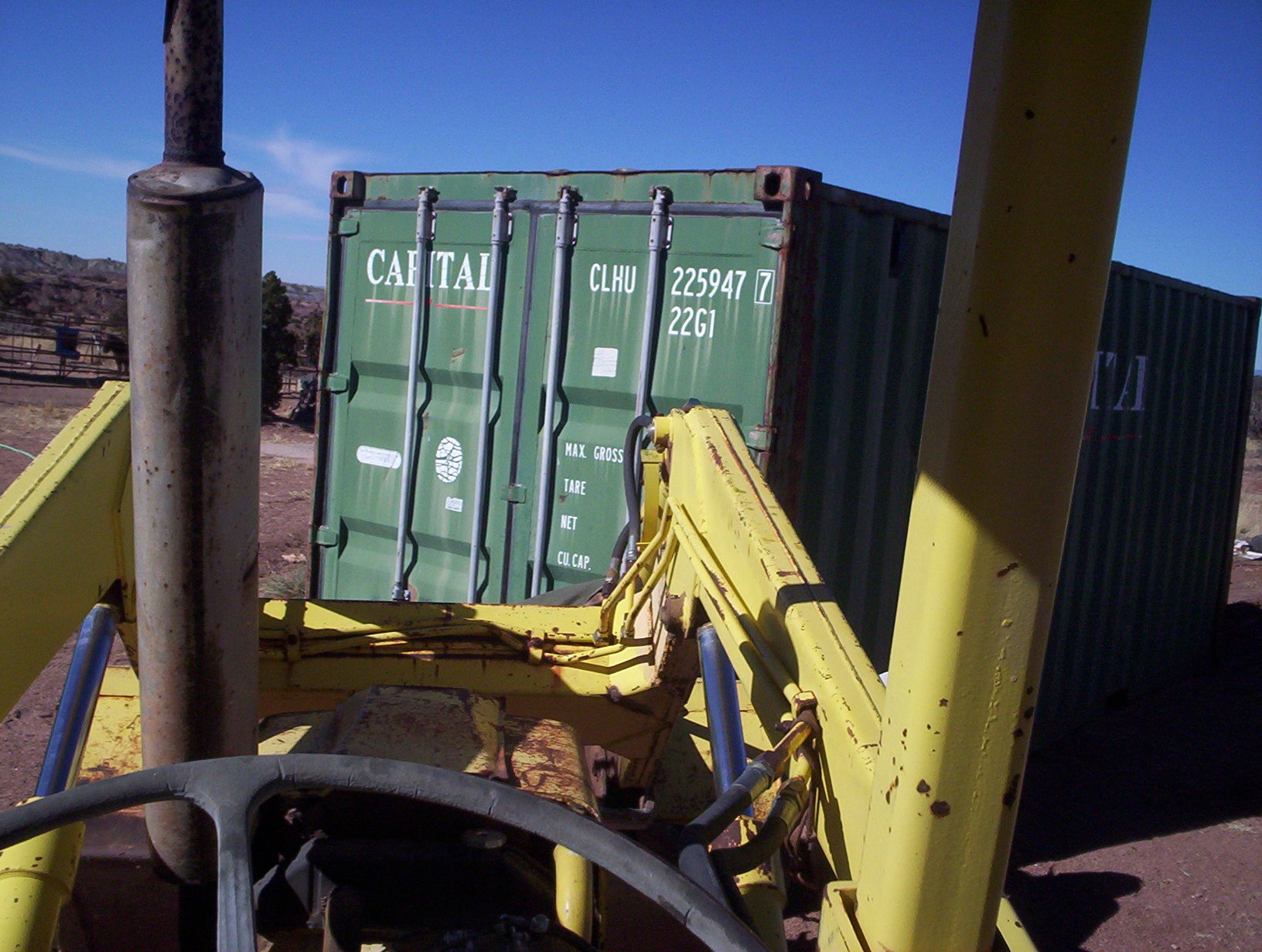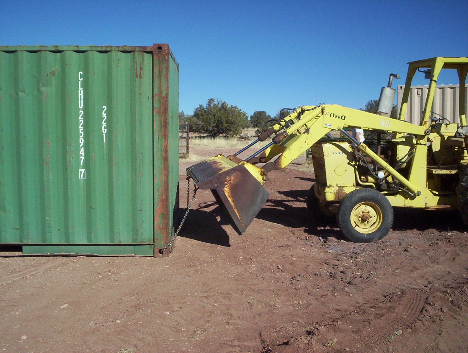 move1Been a while since I started ol’ Gulchy up. Engine’s fine, but the battery seems to have died. I have an old marine battery I use for such occasions, it seems pretty much immortal. But it’s too tall and the last time I used it on the tractor it shorted on the engine hood. So I left the hood off for this trip.move2I guess everybody’s got his bugaboo. With me, it’s chimney fires so I clean mine with neurotic frequency. With J, it’s lightning strikes but he has reason to worry, being up on his high ridge. He gets them all the time and they freak him out. His house bristles with lightning rods but last last summer this storage unit took one and managed to cause some electrical problems. So he wants it farther from his house.move3Way over here between the hay container and the round pen. I have serious questions as to whether this is going to work, but there’s only one way to find out. Ian’s got the biggest, baddest tractor in the neighborhood, so I get a certain amount of social pressure to keep it running.move4Ready or not, here we go. Neighbor D came over to lend some chains and adult supervision. The very first thing that happened was that we broke one of his chains. The very second thing that happened was that we pulled the container out far enough to be a total pain in the ass, then lost all traction.move5Couldn’t turn! Instead of pulling the container at an angle, the container kept straightening out the tractor. So we unhooked and moved a lot, but slowly we got the thing oriented in the right direction. Then once we got out of the gravel and onto harder ground, with a little momentum ol’ Gulchy dragged the container like it was on wheels. Always wondered why he has two reverse gears; now I know.move6Then turn some more, and slide it into its new slot. We got smart and took the round pen apart for this bit.move7Outstanding.move8Home again home again, jiggedy jig.