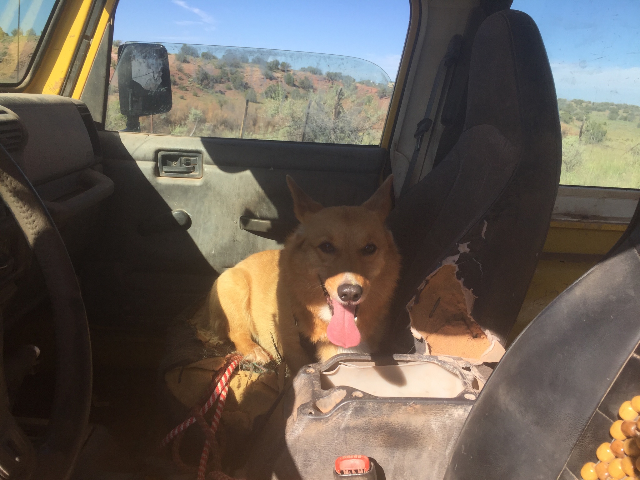 Laddie and I got an earlyish start this morning, out cutting brush on the road shoulders again. We took a little side trip to check out an anomaly in the wash far downstream from my stomping ground – it seems there’s a seasonal spring that right now is running like crazy. Laddie got to declare war on an entire kennel full of dogs several times his size from the safety of the Jeep, and also wade in very shallow water up to his belly, all in the same morning. 🙂