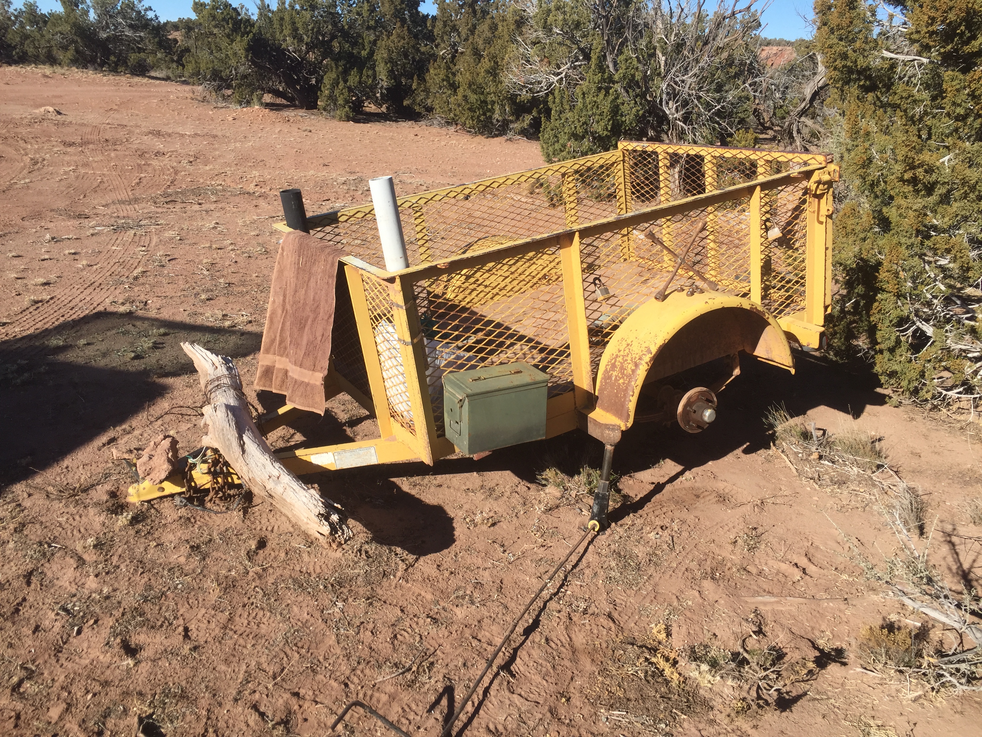 Picked the wrong place to put the jack. I was watching the tire, and began to wonder why it didn’t seem to be rising. Looked around and found the trailer tongue was moving instead. So I found a rock and a piece of driftwood that got flung out of the wash during that flood in August. Appears to have been used as a fencepost at some point. Anyway, that weight got the wheel off the ground without my needing to reposition the jack.