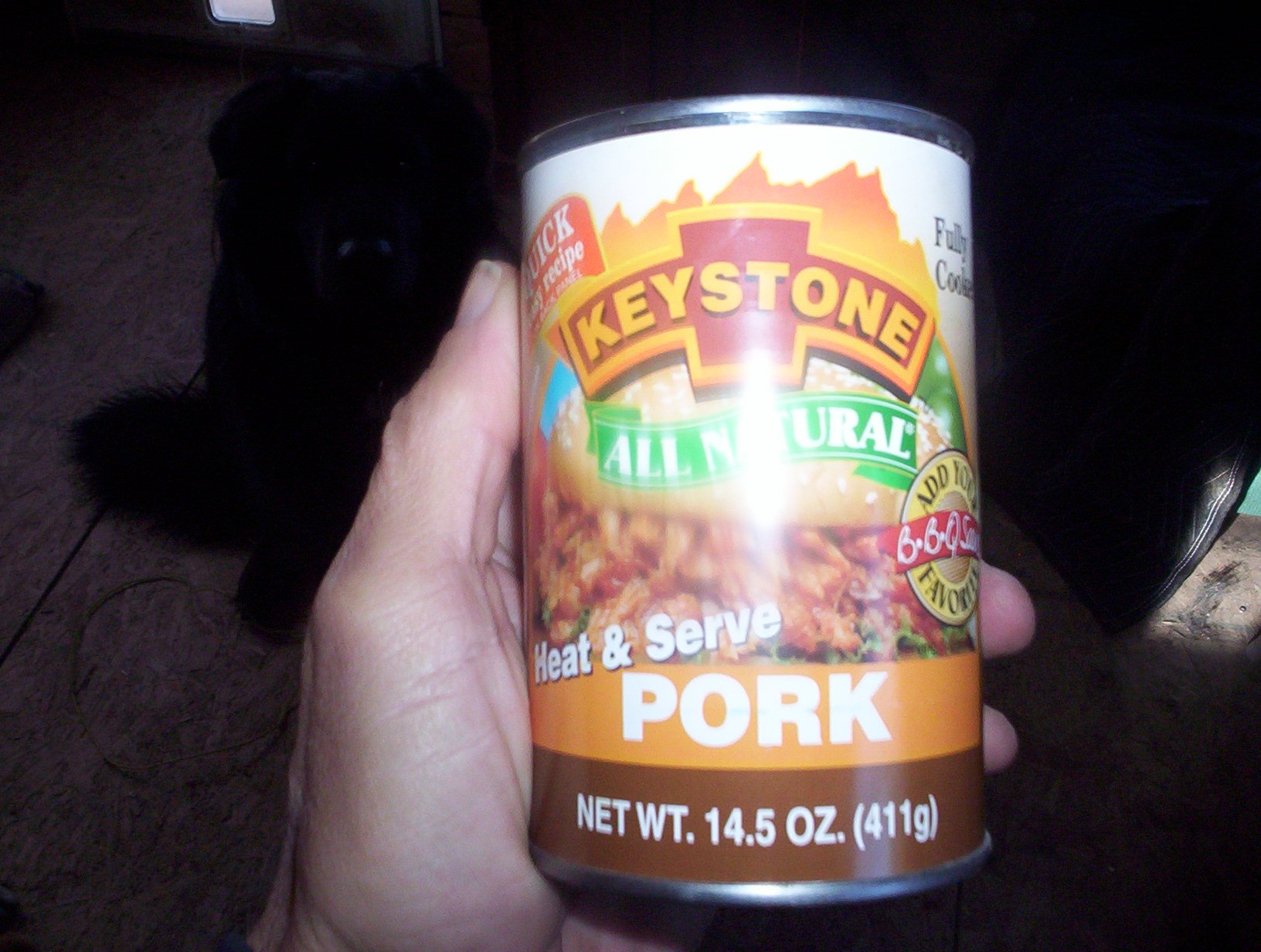 “Heat and serve pork,” to me, screams pulled-pork sandwiches. I approached this one with trepidation, because I bow to no man in the extent of my love for pulled-pork sandwiches and I haven’t had one in years. The label suggests barbecue sauce, and that sounded like good advice so I waited to open this can until I had the ingredients to do sandwiches right. As a fall-back, it would go into spaghetti sauce.