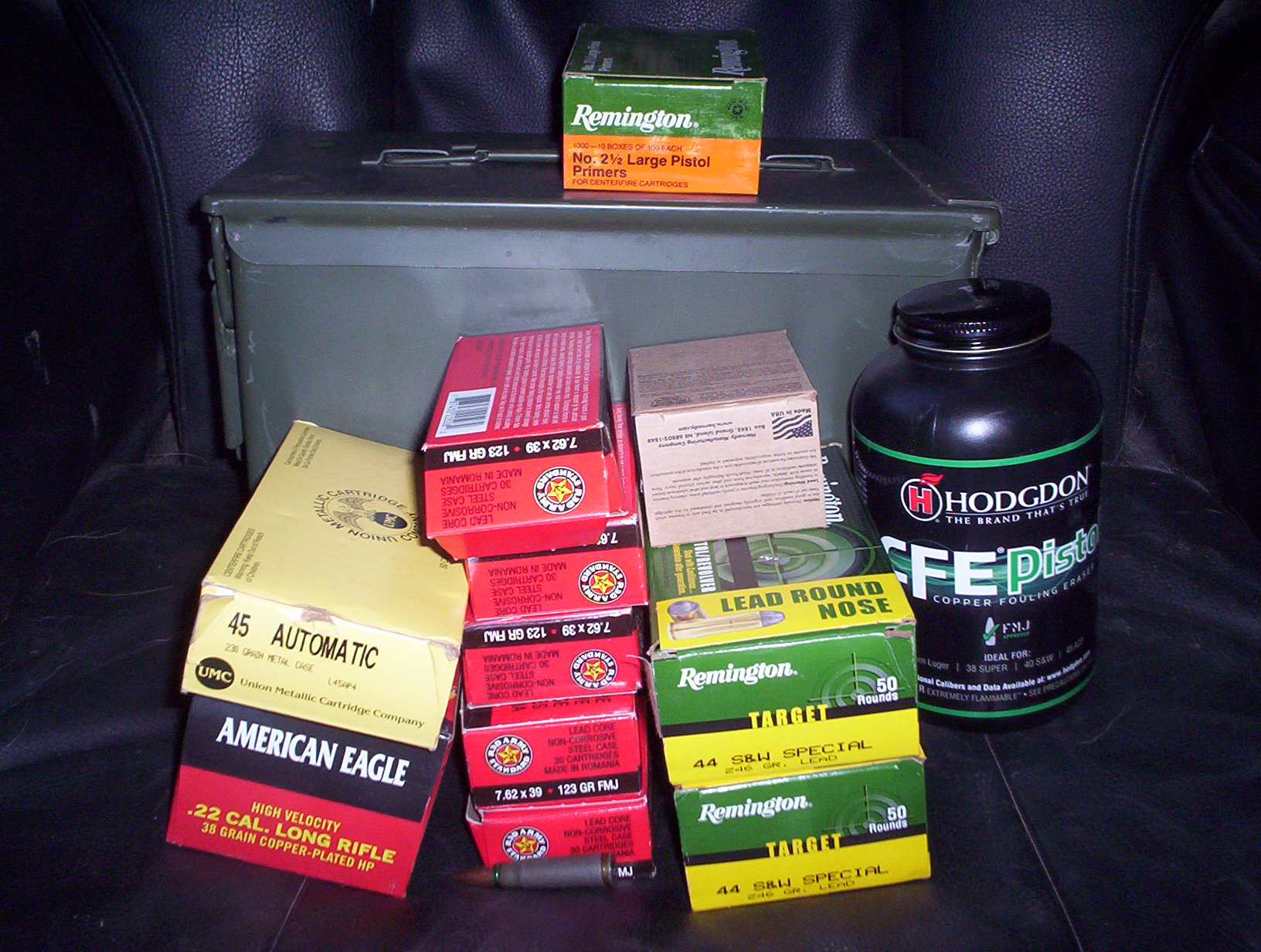 Holy cow. Some of this has become impossible to find around here. A brick of high-vel .22, reloadable .44 special, a box of .45, a hundred rounds* of 7.62 Commie for the AK, and primers and pistol powder! All in a brand new ammo can I can definitely find a use for. If I had doubted before that he was a regular blog reader, this would have put the doubts to rest.