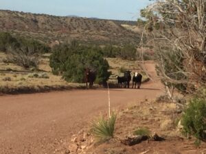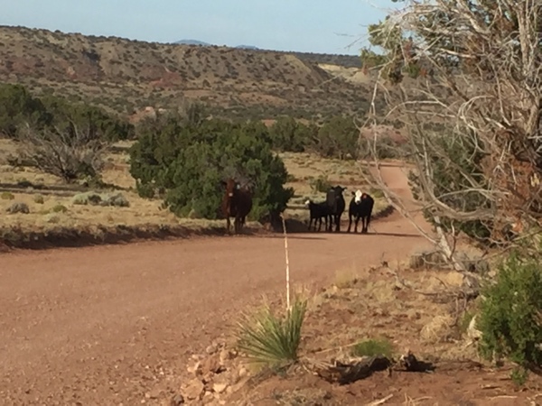Incoming from the right was a small pod (herdlet? whatever.) of cattle which immediately stopped when they saw the human. (“What’s it doing, Harriet?” “I don’t know what it’s doing or what it wants, Maude. But be ready to run.”)