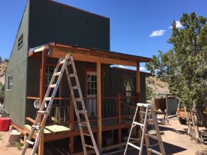 …I realized I had to come out away from the porch post at the bottom to avoid the concrete pier. The downspout has to meet the elbow of a buried 4″ sewer pipe running to the nearest ditch. And that will require two more elbows than I have. I’m going to go raid Landlady’s barn right after lunch but I’m not very optimistic.
