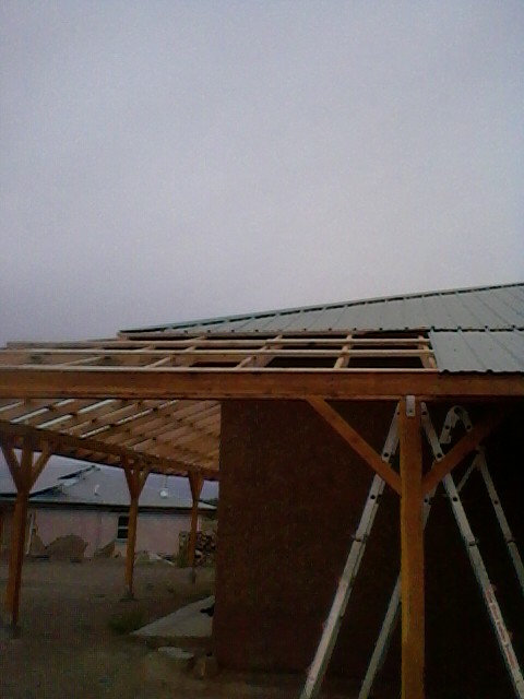 Regular readers will recall that this spring I helped neighbor D dig and pour the columns for the all-around veranda they planned for their earthbag & strawbale extravaganza. Two years ago they spent all season mudding the strawbales, and last year’s epic monsoon washed a bunch of that mud right the hell back off. The only part of the exterior that remained undamaged was the part under the veranda on the north side of the house. So, the simplest solution seemed to be to extend the veranda 180o.