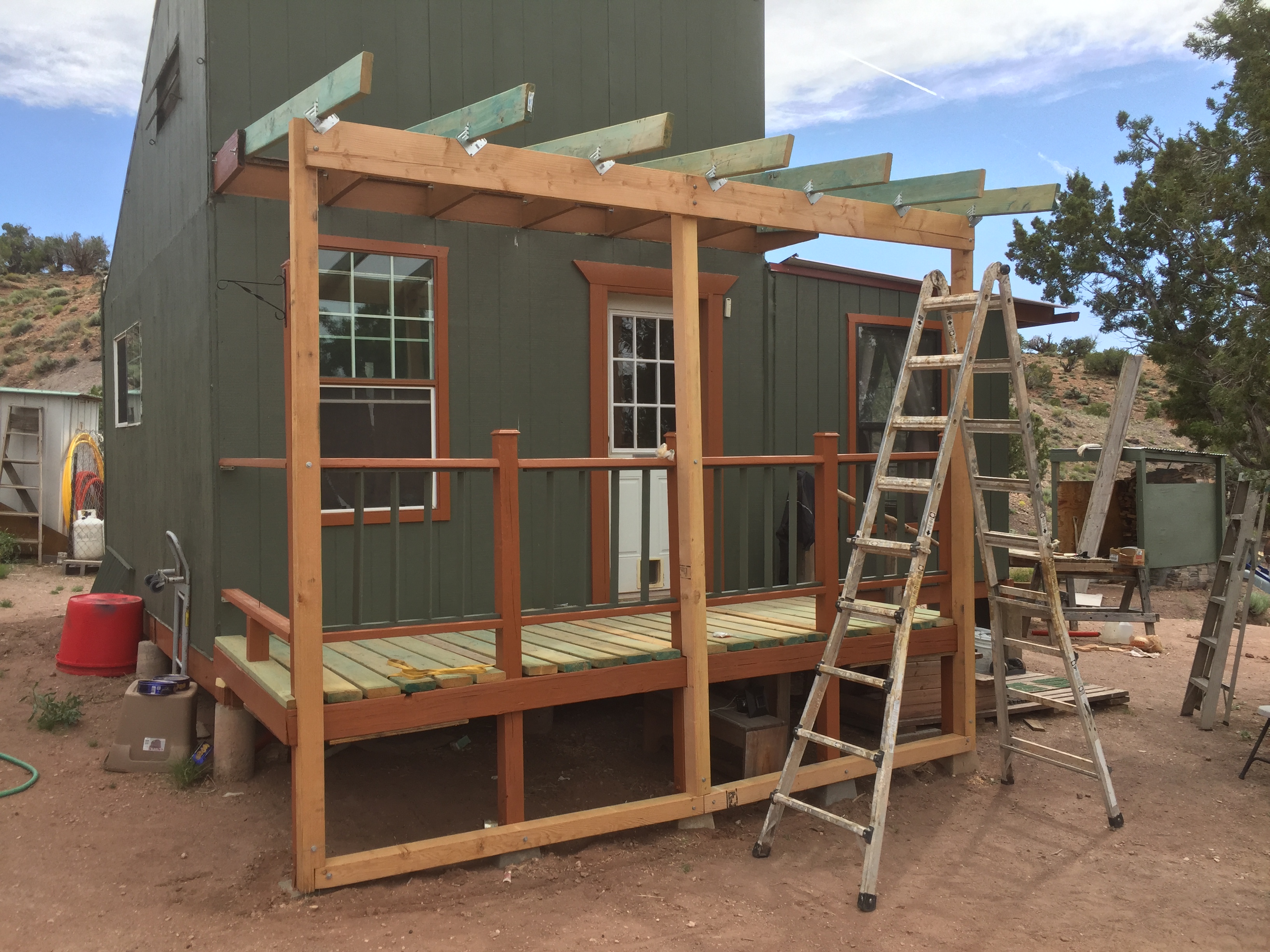I did jumpstart the Wayback Machine, and it mentioned that, looking at the 3 posts supporting the roof structure there is an opportunity to include as a “Design Element” a pair of notched and fitted “X” sections (using matching 4X4 lumber) inside (specifically, not on the exterior surface) and between the 3 posts, running from railing height to just barely above the concrete bases. That such a “Design Element” would make the post structure extremely ridgid and resistant to any future misalignment. As in racking. And, done carefully with the joints (reasonably) tightly fitted would also be attractive.