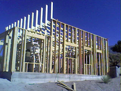 Tired and sunburned, and on schedule. We got the dining room framed in, one interior wall, and all the main roof trusses up.