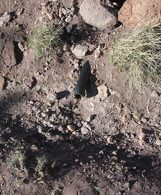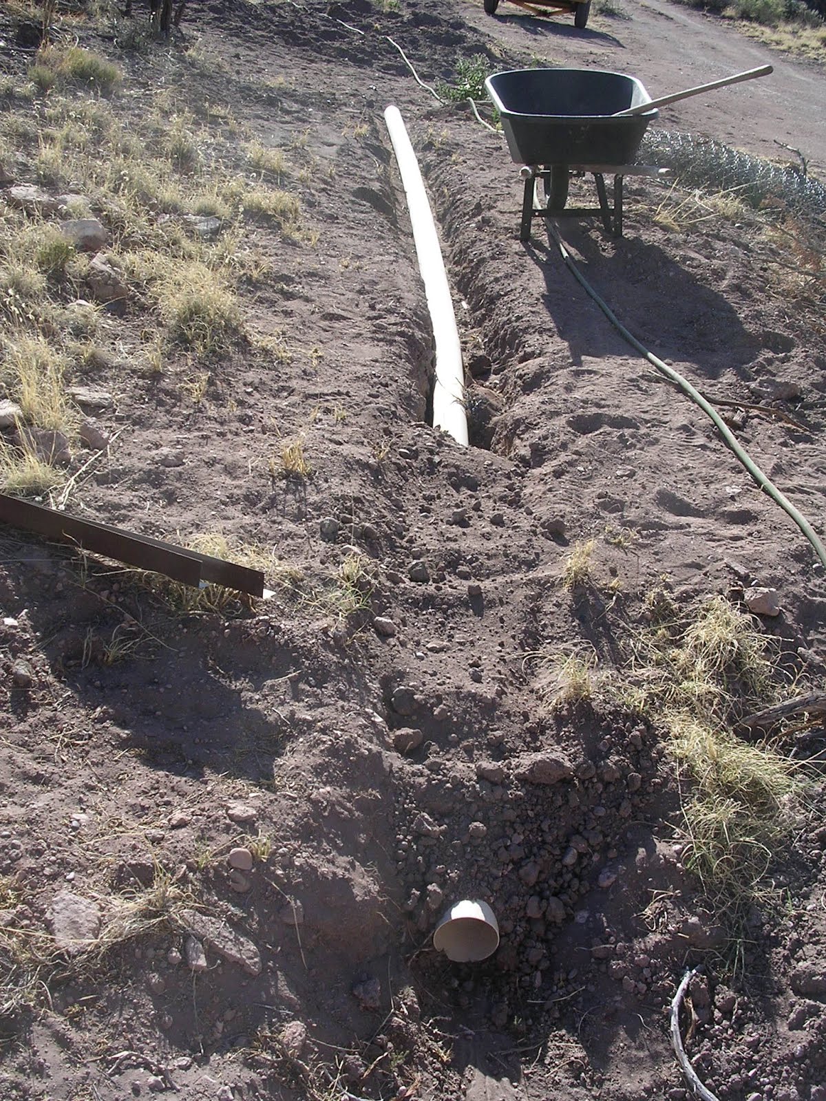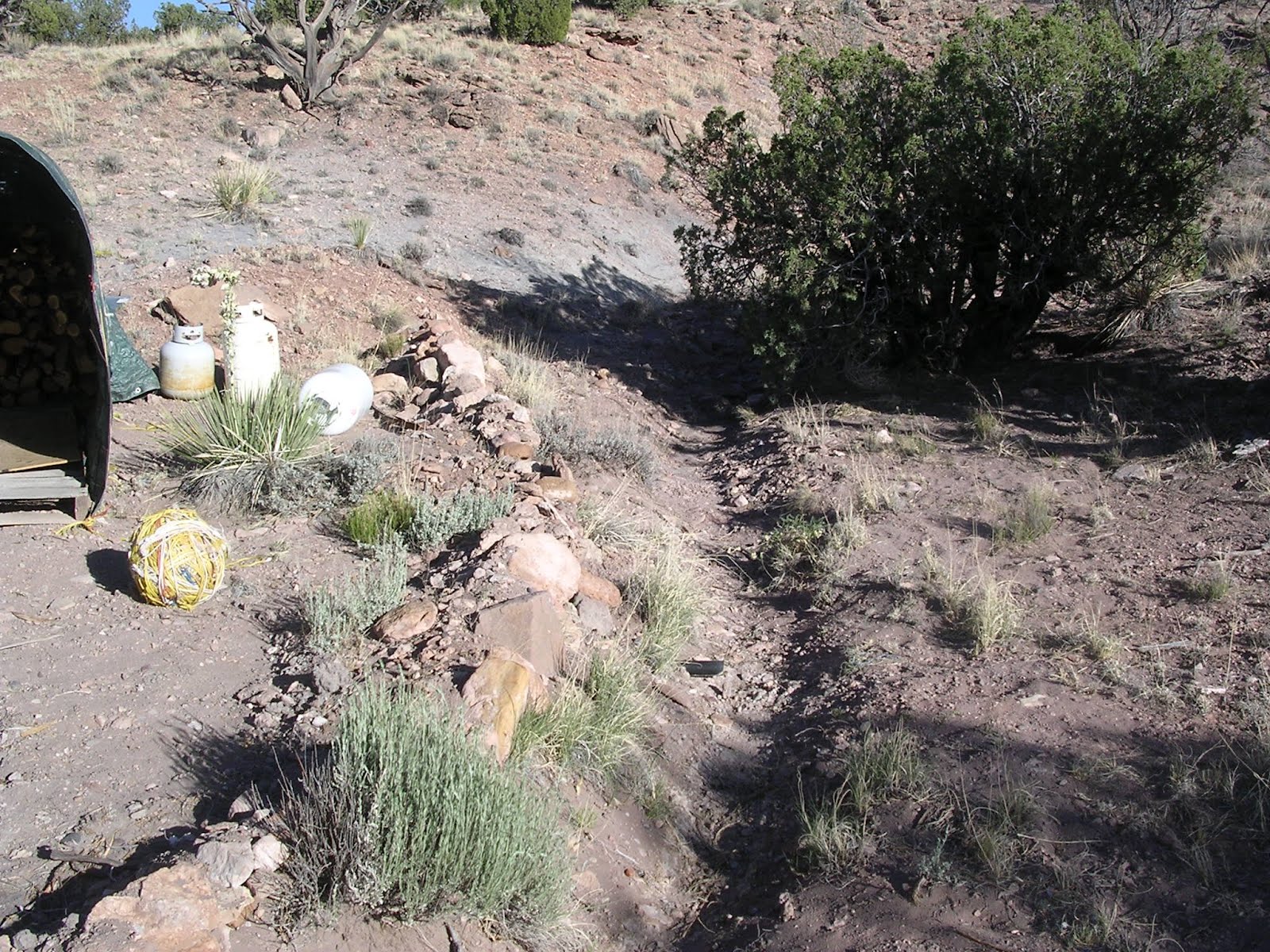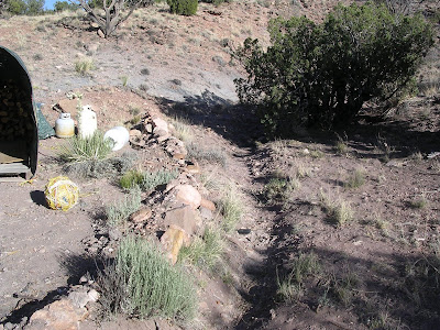 The problem with this particular gully is that it’s right behind and above the Secret Lair. Gullies are normally dry, rocky things of no particular interest. But sometimes they become wet rocky places and that’s the problem. This one, when it runs, normally flows into a little natural trench that turns sharply left at the bottom and sort of lets the water sheet off to the wash. But sometimes the water jumps the trench, and then it wants to go right where the Lair is. It doesn’t happen every year, and when it happens it isn’t always bad. But we don’t plan for the best-case scenario.