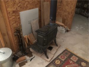 My friend Ian has many fine qualities. He’s brilliant and talented and obsessively hard working when the project interests him and he likes guns but he’s not a civil engineer. He had this idea, back when we built his place in 2009, that little or no winter heating would be required. He was – not as right as he usually is about that. We did retrofit it with Landlady’s cast-off woodstove (which worked just fine in her cabin, though it was too small) and found that we couldn’t get it to sustain a fire at all. Too little firebox, too much stovepipe, not enough draft. And it’s been that way ever since. But I needed a place to put my larger and still perfectly good woodstove, so…