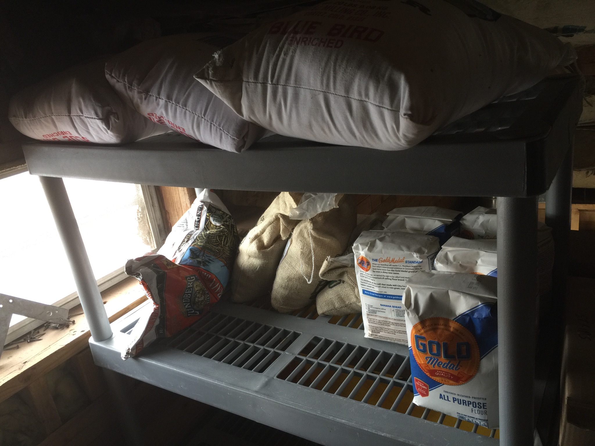 Which I like! I can put cardboard containers of (mostly not food) stuff up there without needing to worry about it being torn to shreds by rats. The powershed pantry has now been completely retired except for the bulk buckets – because overhead storage for a 40-pound bucket makes zero sense – and that has given me much more room for tools and parts. I’m loving it!