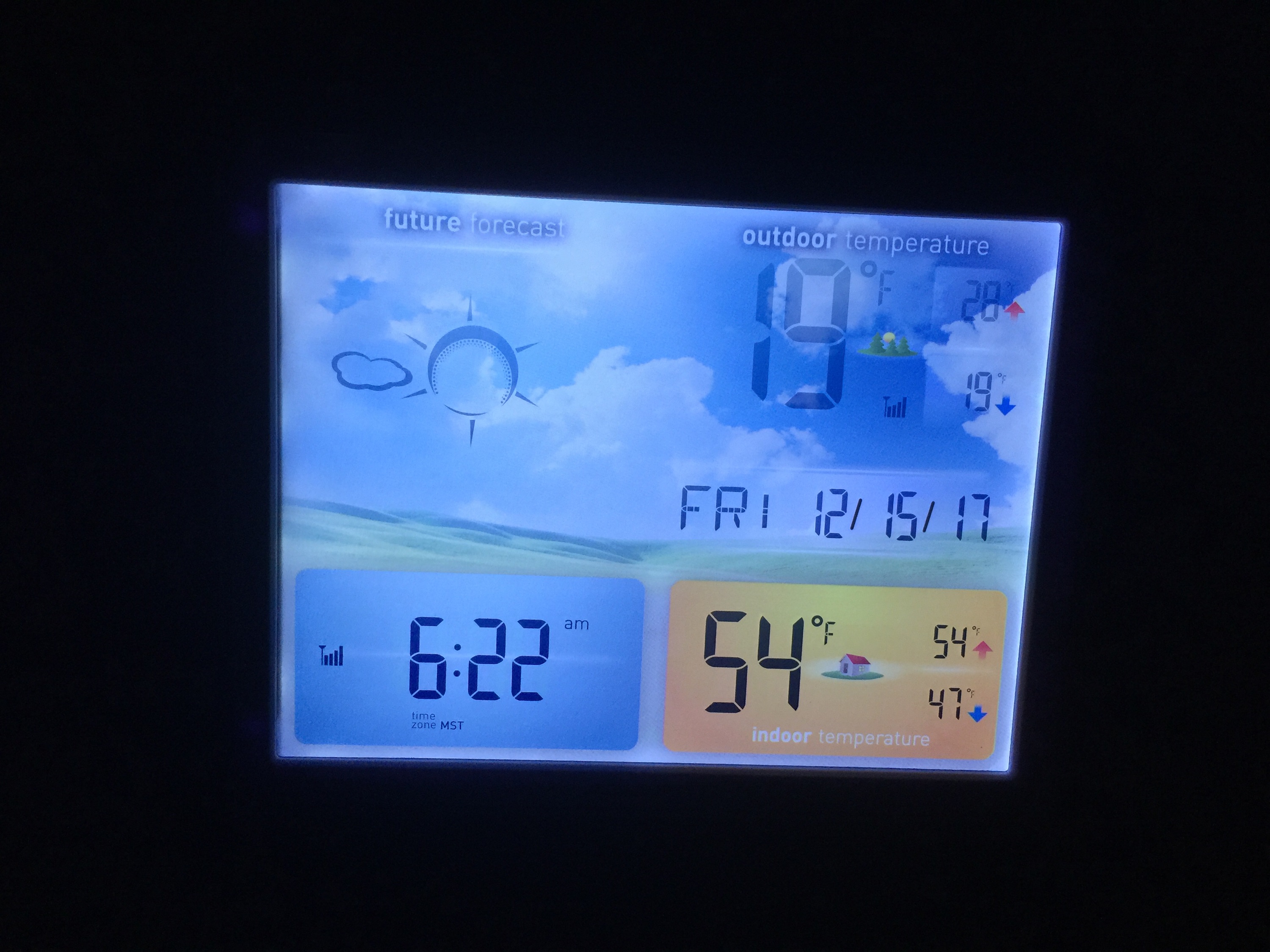 “Do we interpret that screen to reveal that the new wall furnace maintained a low temp of 47 degrees” Is that indoor/outdoor thermometer still in the main part of the Lair? If so, is it possible that you have too much heat leaking from the bedroom through your temporary “door”.