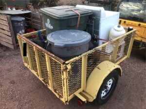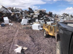 …and drove to the landfill. Emptied the garbage at the landfill, then drove to the boneyard to dump the washing machine. I always worry about the process of getting the trailer from the Jeep to their big truck – I think this is the third time we’ve done it in many years – but it always goes pretty smoothly.