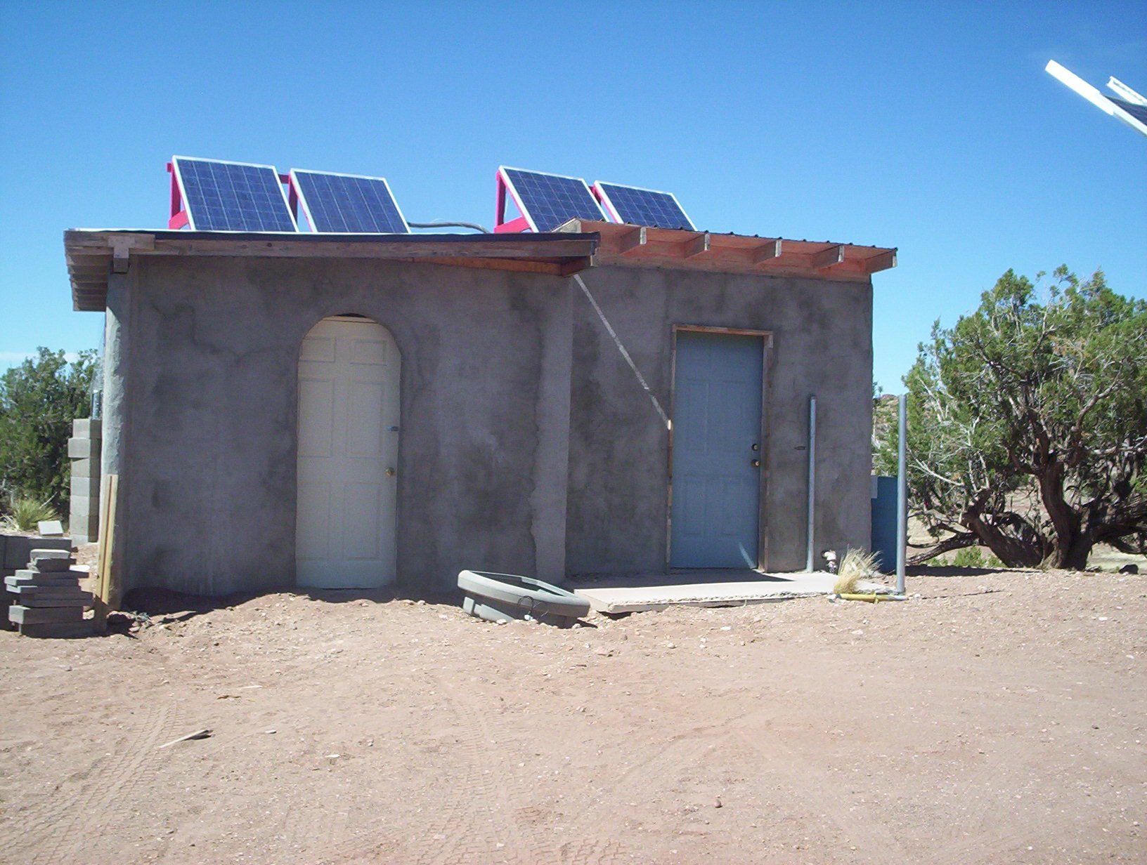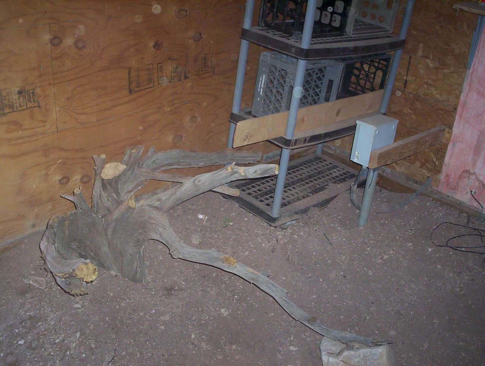 This was my only contribution. I cut two juniper stumps to size and trimmed off all the vertical branches for roosting places. One on the side here, another in a far corner. Those milk crates on the shelves will be nesting boxes.