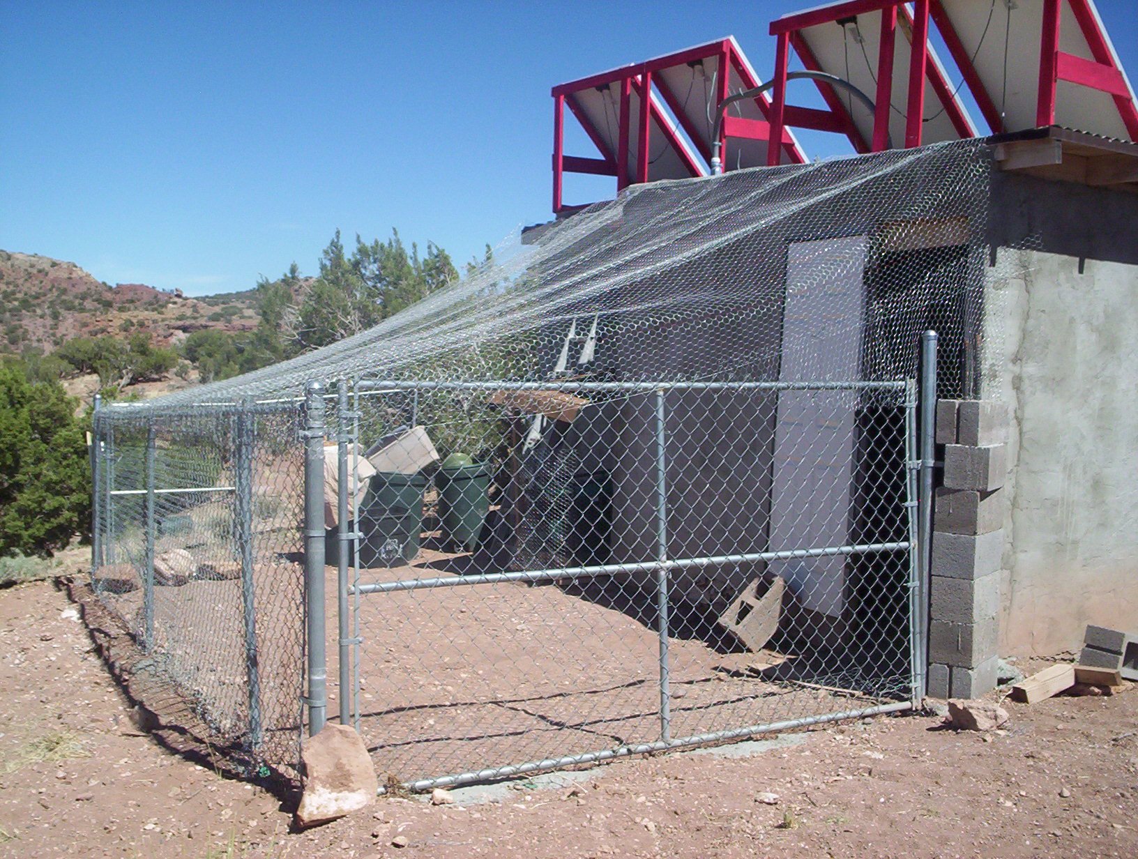 Landlady did a beautiful job of roofing the dog chicken yard, to protect against raptors and escape inadvisable excursions.