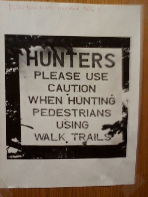 That ‘s interesting, I interpreted the sign to say, you should be careful while hunting the pedestrians who were on the ‘walk trails’.