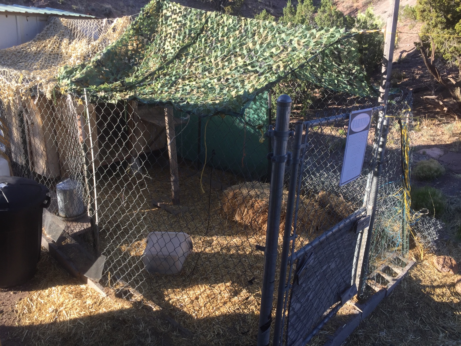 Naw. It was built to keep coyotes out. He’s much bigger and stronger than any coyote but was never much of an escape artist even when he was young and feisty. Now he just wants a comfortable nap.
