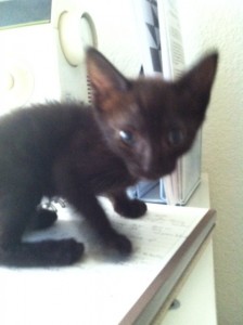 Provisionally, unless something better comes to mind, her name is EeBeeCee. Because she’s the emergency backup cat.