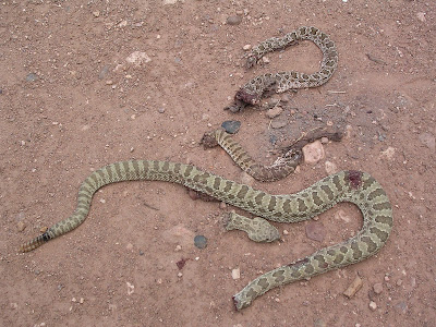 So! Lessons learned: A .45 is not a particularly impressive fight-stopper with a rattlesnake. A shotgun is messy and perhaps excessively effective. A shovel works just fine.