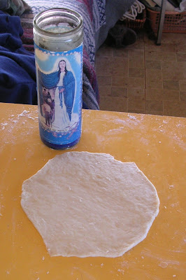 I think about rolling pins every time I need to, you know, roll out some dough. Then I just start looking for anything cylindrical and normally settle for a soup can or something. Landlady found that those religious candles so common in stores around here (non-Catholics call them “Jesus Candles”) work perfectly. We keep them around for other purposes, and I hadn’t thought of putting one to this use. But having now tried it myself, I can testify that they work great.