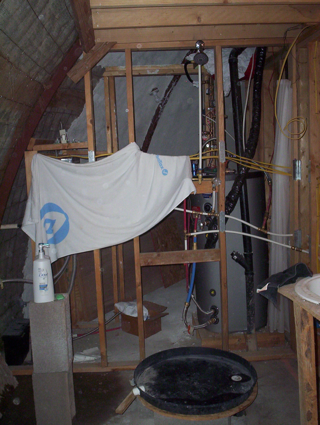 Believe it or not, he actually got a final sign-off with that shower. And now it’s got hot water. Ian tells me the construction of an actual artsy shower stall is the next step now that the kitchen is functional. He didn’t stucco in here because he has other plans for the walls.