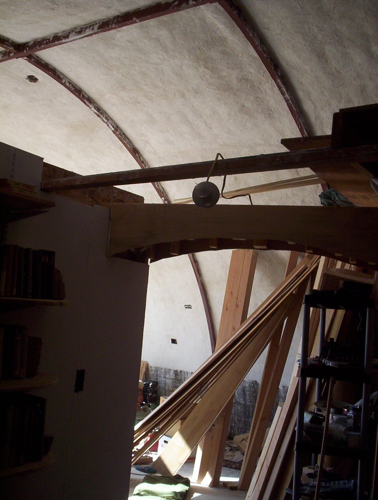First he finished the interior stucco, which was a real joy. It instantly transformed the interior space from “unusually horrible warehouse” to “unusually horrible warehouse with white walls.” Then he vacuumed up a brazillion tons of stucco dust, which helped a lot toward making the place livable. Seriously the white stucco does allow you to move around even in the storage space in the very rear without the need for a caver’s helmet.