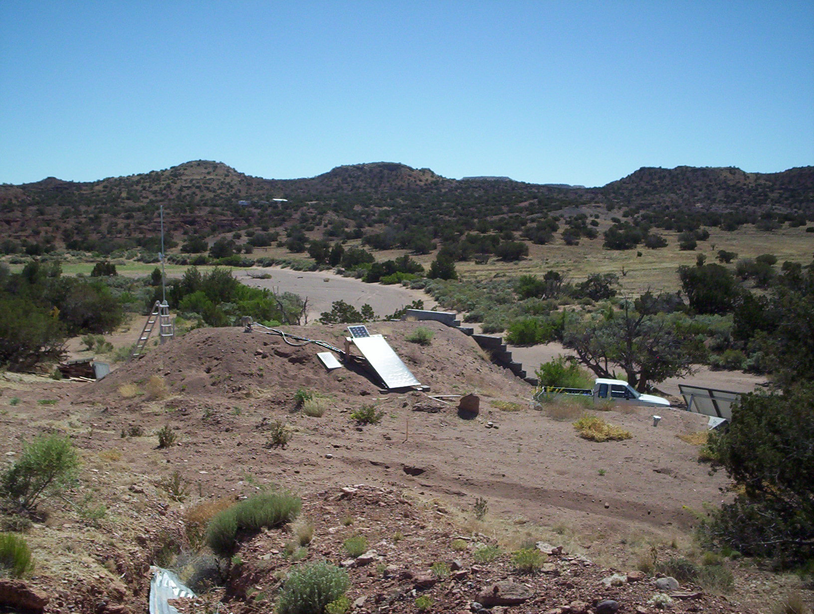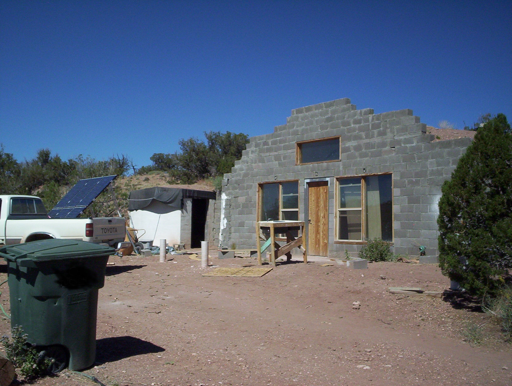 Lots more dirt could be hauled to blend it into the hill better, if we could only figure out how to pay somebody else to do it. But the dome and powerhouse are as buried as they’re ever going to be anyway. If you click for embiggenation you can see the heat exchanger for the water heater and the mast for the cell antenna, though clearly some prettying-up remains. We’ll be moving the solar panels up here at some point as well.