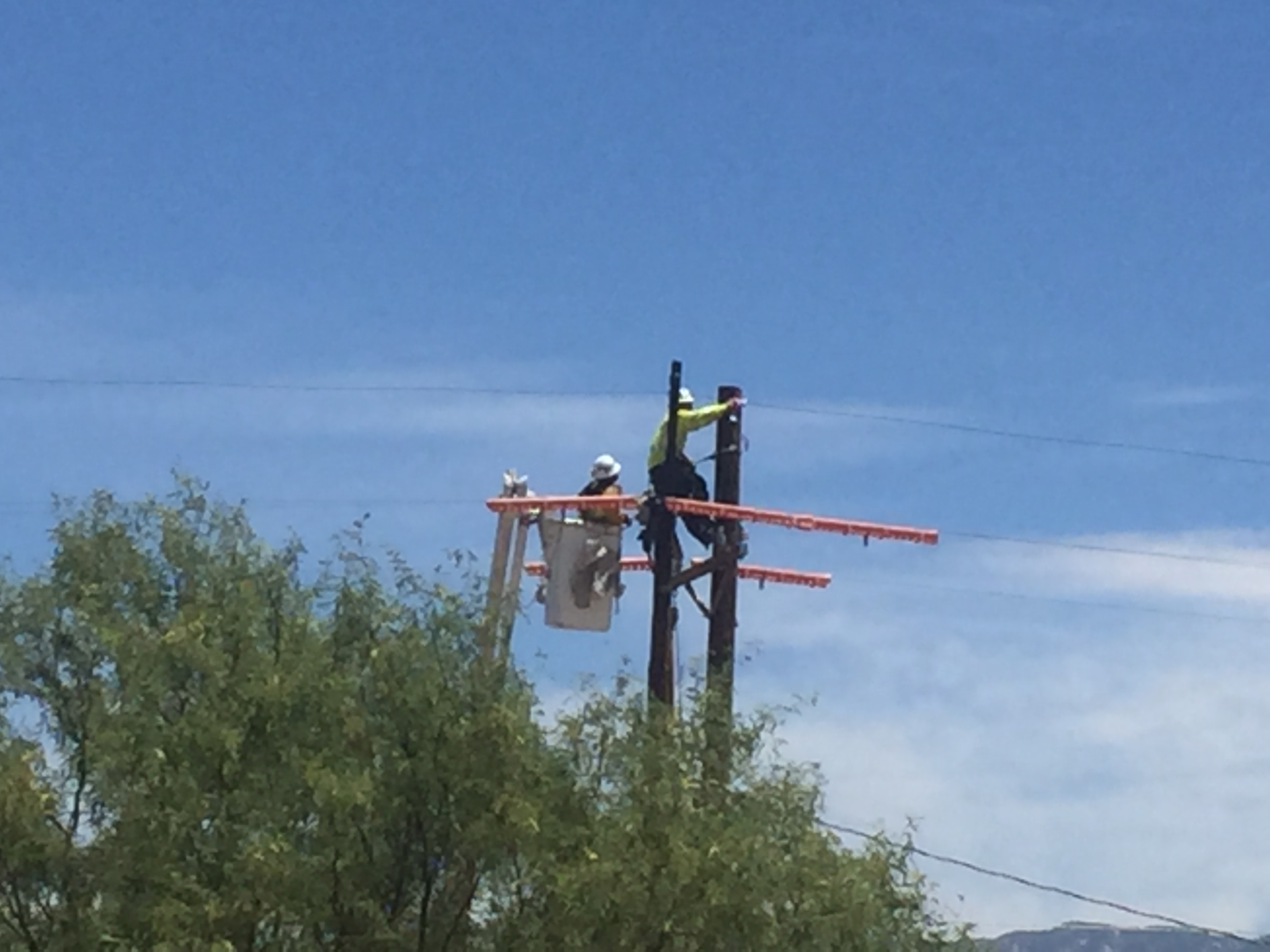 Given how careful they were being with insulators and such I did not have the impression it was a dead pole. They had two bucket trucks there but the one guy was using spikes so I guess there wasn’t room for two buckets. They transferred the lines from an old pole to a new one and then chainsawed down the old one in pieces.