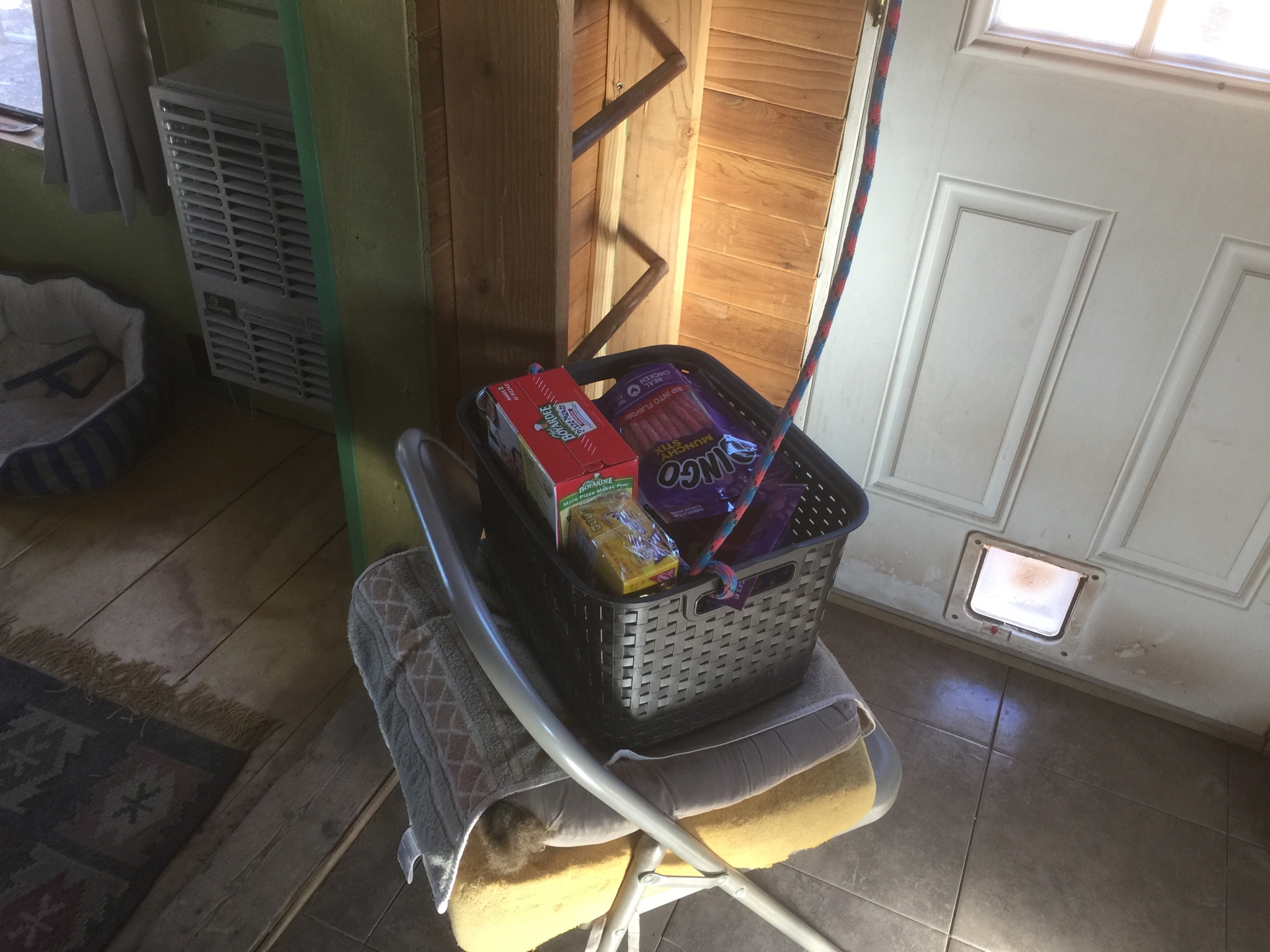 I never came up with a non-clunky way to get food up into the loft. I wouldn’t call it a problem exactly, but my solution isn’t very elegant. I tied a rope to this little dollar-store basket, which is as big as will go through the small hole in the floor – and also as big as you’d want if you’re hauling canned goods: That basket can get heavy…