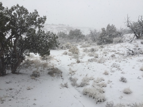 Got to the Big Chickenhouse without undue drama; ironically my biggest concern was watching for a flash flood while I was in the wash. Tended chickens, unloaded water, and there was a blast of cold and the rain turned abruptly to snow and then to a lot of snow.