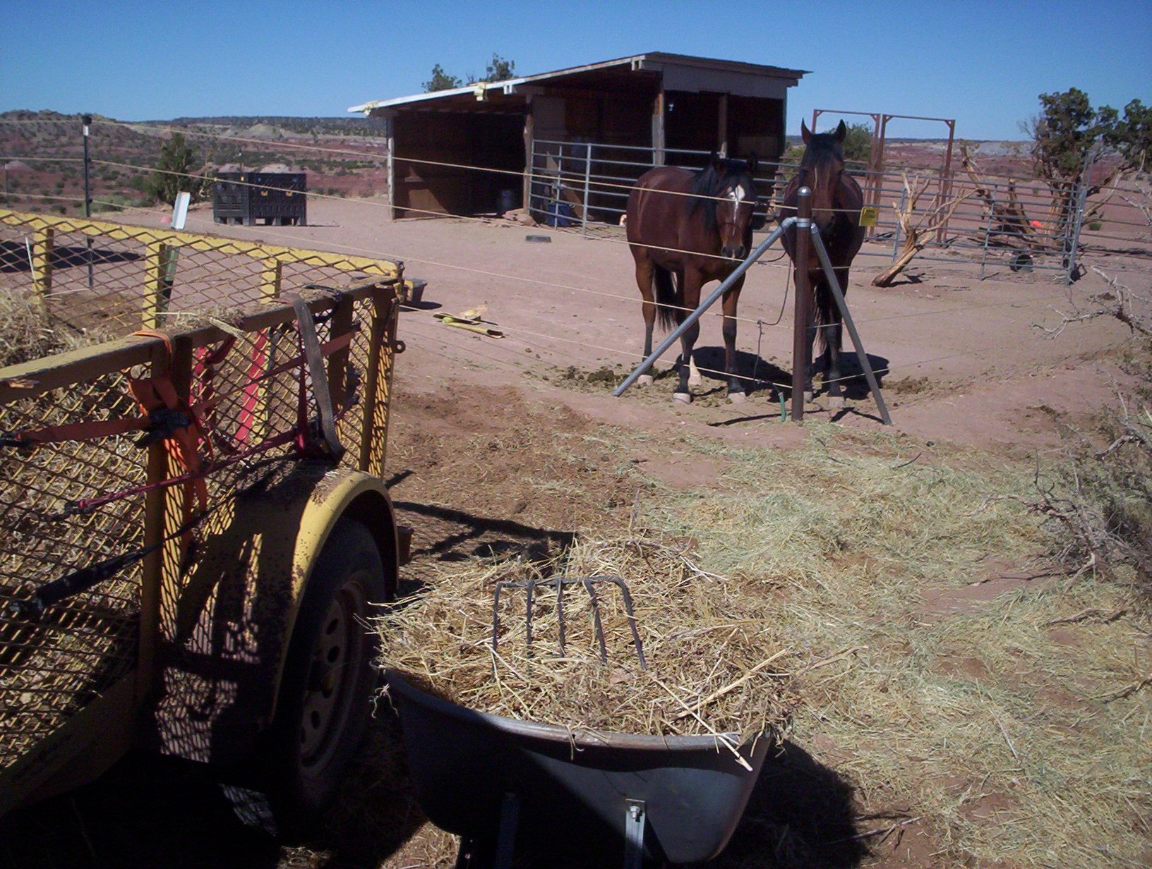 The hay and other stuff, old tumbleweeds and various sorts of flammables blow onto and through the fences over the course of a year. J, who has a perfectly reasonable fear of fire, likes a fat ten-foot dead zone between the fences and the forces of nature. So for the past two years he has hired me to rake it all up and make it go elsewhere.