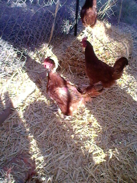 This is Edith. (It’s a sad fact that the only chickens who acquire names are the interesting ones, and ‘interesting’ almost never works out well for the chicken in the long run.) It’s a lousy camera-phone picture, but if you could see her clearly you’d note that Edith is the sorriest-looking chicken you’ve ever seen. There’s nothing really wrong with her, she’s perfectly healthy. It’s all about Selma, who has plucked Edith bald. And Edith allows it. Welcome to the pecking order, which in small RIR flocks can have lethal importance.