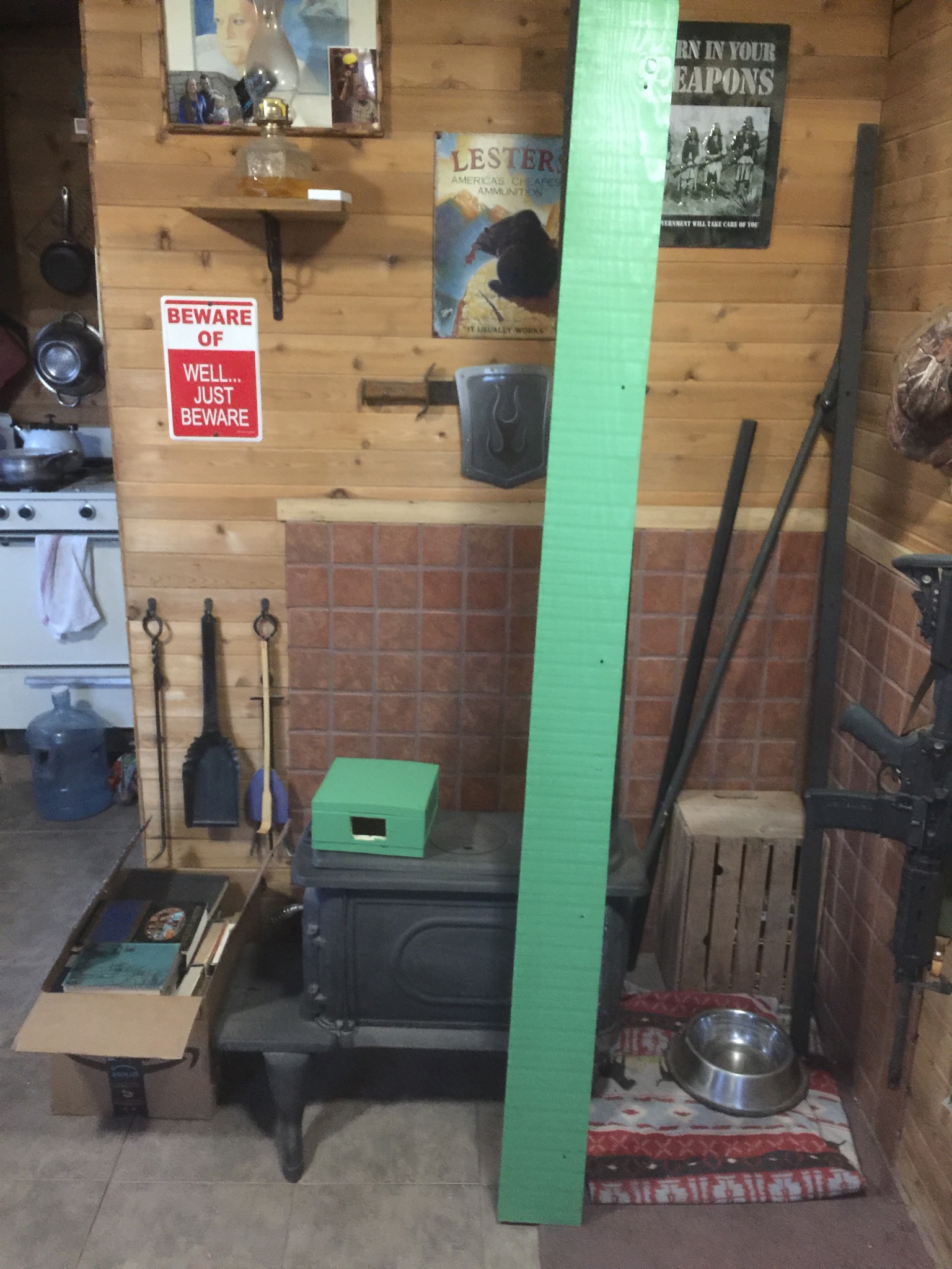 But first paint, of course. Yesterday’s big lumber run included a gallon of green paint, so (what I had hoped would be) the last official piece of work for the day was to haul the plank and the wooden ceiling box to Ian’s place where it was still and warm, set up a secure paint-proof work space, and give both items two coats of green paint.