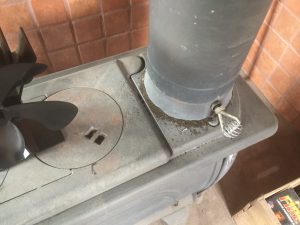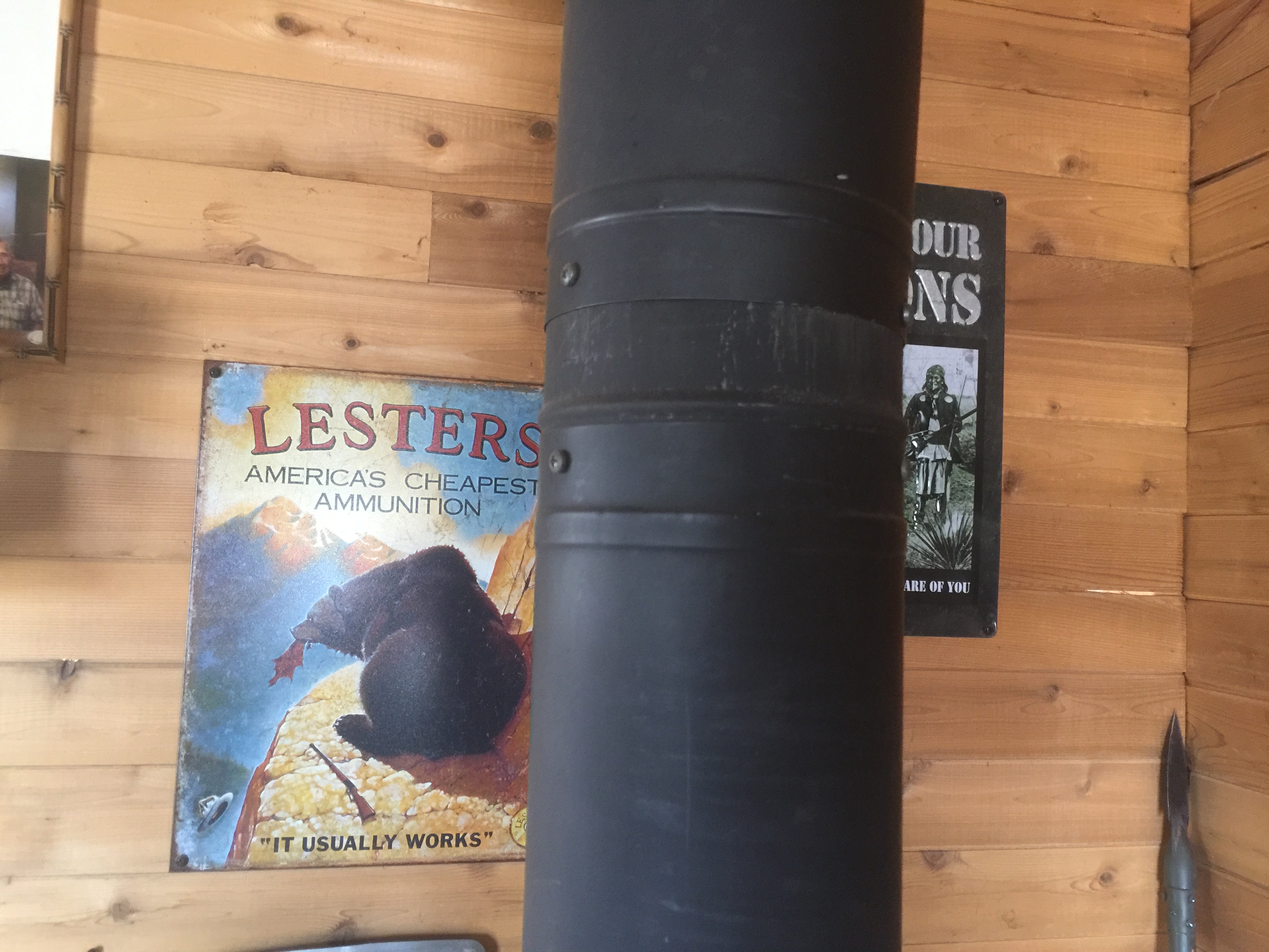 Yesterday afternoon a small bird, the first of the year, got into the stovepipe. No problem, he flew around the kitchen window for a while but I caught him without any issues and he’ll live to screw up some other hermit’s day. But on his way down the pipe he shook loose so much soot he reminded me that the pipe hasn’t been cleaned all this winter.
