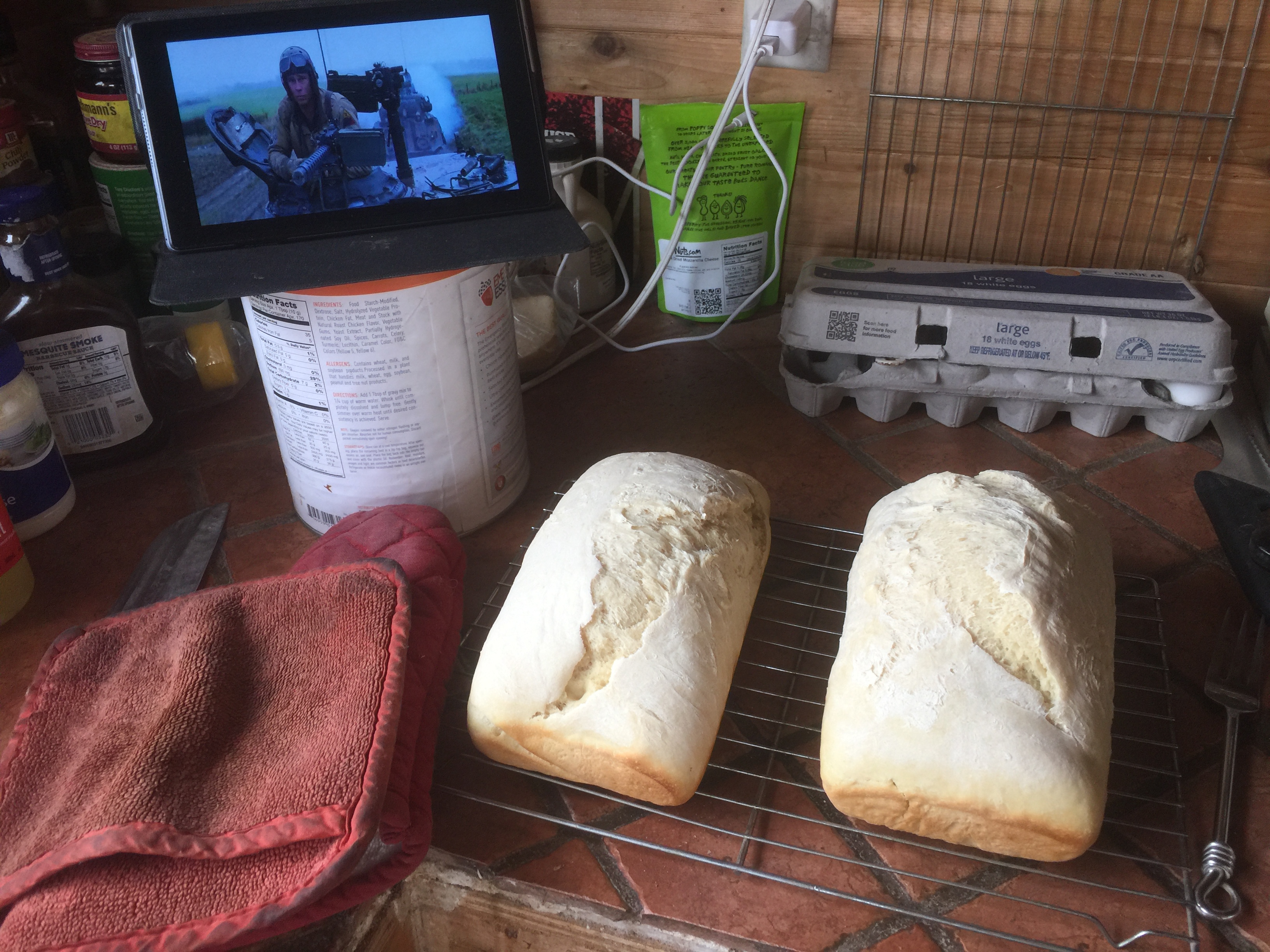Baking day! I have found that making and kneading the dough is a lot less tedious with some entertainment on the counter. Normally I watch Youtube videos but connectivity was not allowing that this afternoon. Fortunately I’ve got movies on that tablet Big Brother gave me last April. Nothing like a nice cheerful upbuilding war movie where everybody dies…