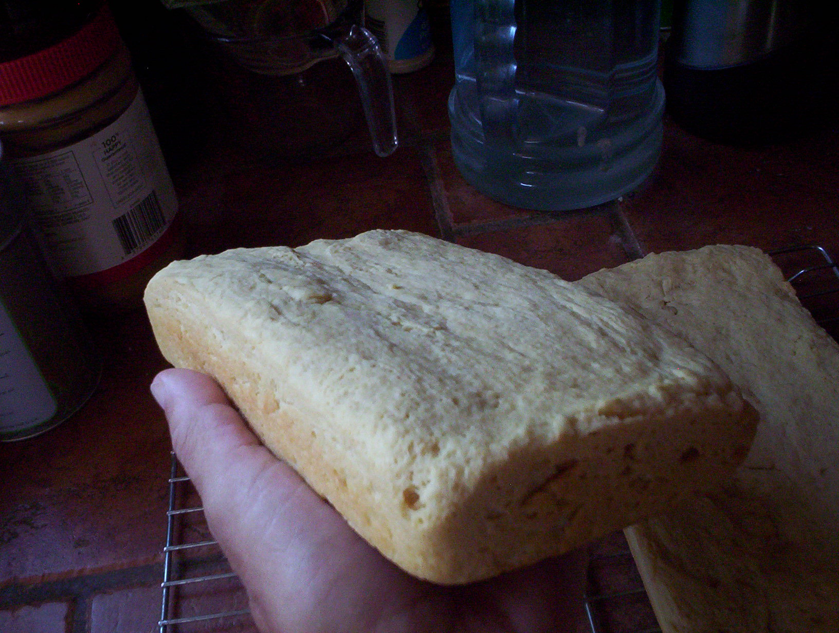 100_5061The second rise basically didn’t happen. I gave it over an hour and a half and it didn’t happen. This was with every precaution, after proving the yeast, getting a good first rise, keeping it moist in the oven.