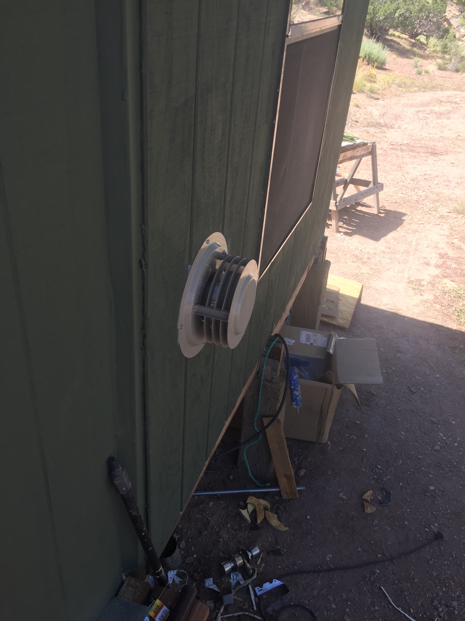 It took us a while to get the vent pipes cut to the right sizes, (the hot air outlet is concentric to and inside the cold air inlet, which is kind of clever) but then we got to cover the big appalling hole with a pretty vent cover.