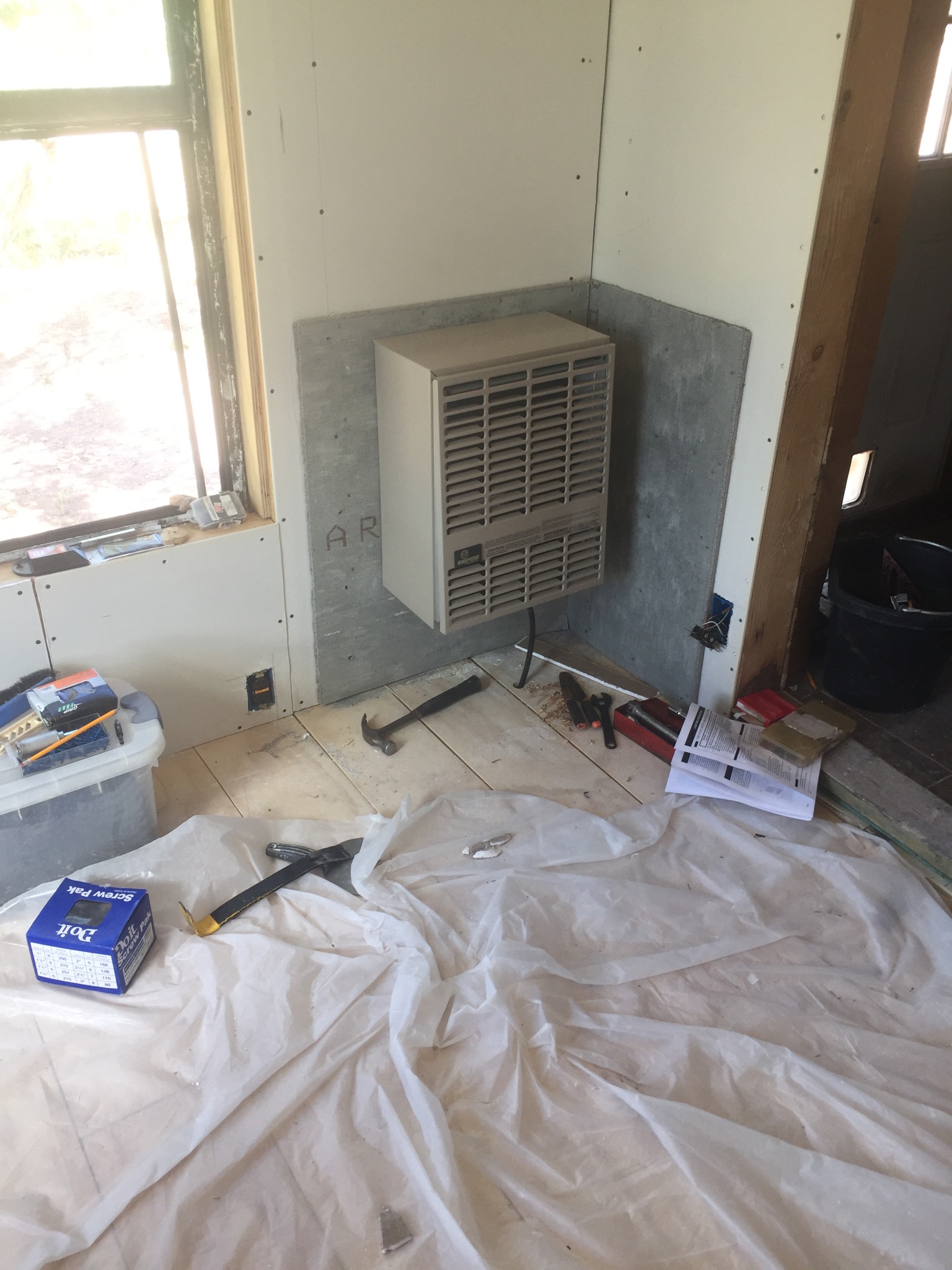Very pretty heater corner. Methiinks you need to cover the cement board with some nice tile or maybe sheet copper?