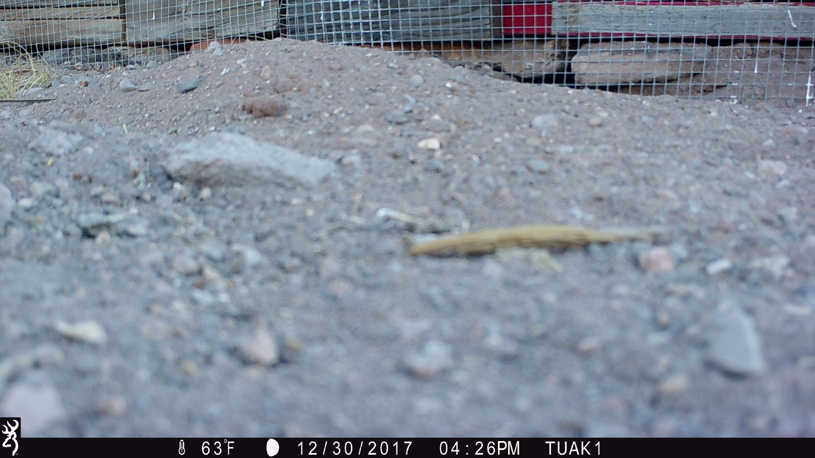 One of the things I’ve wanted to do with a game camera is put it outside an active nest that something dug under the new woodshed. I think the something is probably a packrat – packrats usually make big untidy pile nests, but they can dig quite well. In particular I’ve seen plenty of pregnant females tunnel under things. And this is right where I predicted packrat nests would turn up, which is the reason for all that hardware cloth. She can get under the wood piles, but not in them.