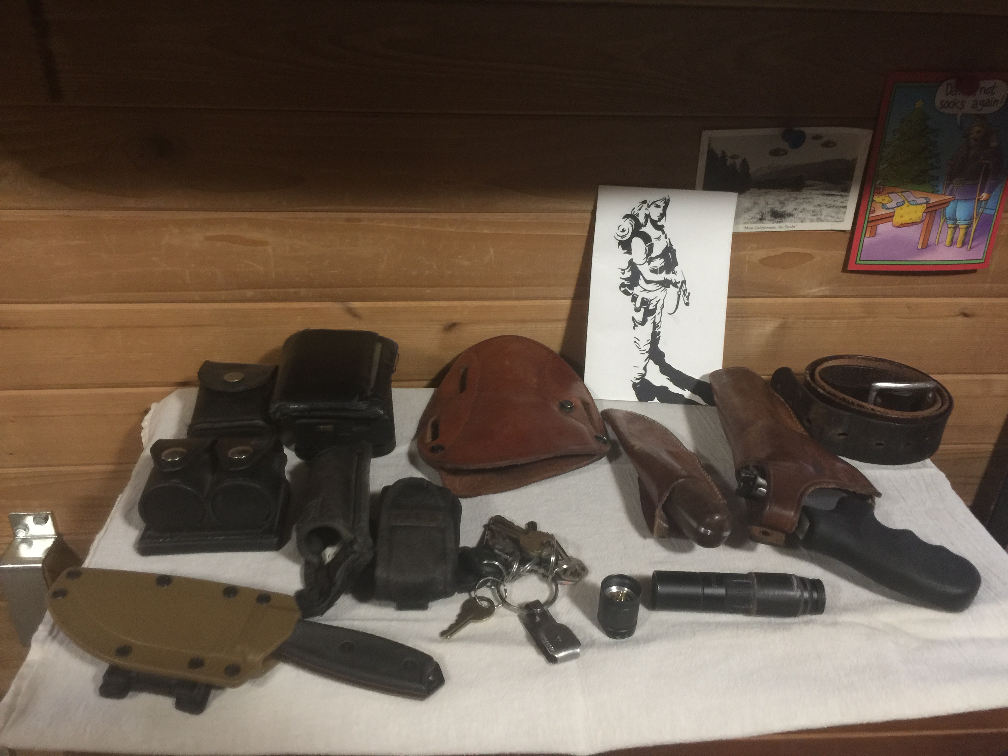 It posed a small logistical problem because the top of the heater makes a great place to stash all my belt stuff but it’s probably not a good idea to leave live ammo on a working heater. Had the same problem last winter and never really found a good solution. It’s a small cabin with not a lot of spare horizontal space. But this time I got a little more proactive. There’s a cabinet beside the front door that always collects stuff I mean to take back to the powershed. Normally the stuff piles up and collects dust. This evening I cleaned it all off: there was literally nothing on the cabinet that actually belonged there. Then I moved all the stuff that had been on the heater…