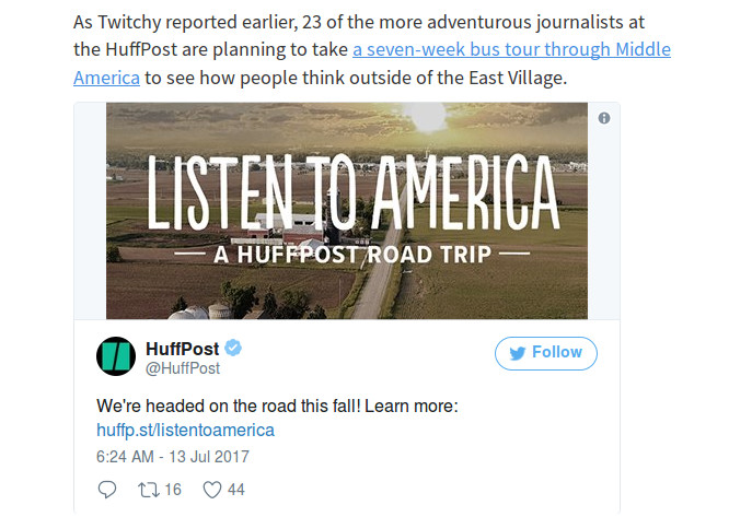 Uh huh. Turns out [a rotating group of Huffpo “journalists] is going to [“visit,” in some form] a bunch of Hillary-voting cities in red states as an expensive sort of publicity stunt. And this will restore the faith we toothless rubes have lost in ‘media.’