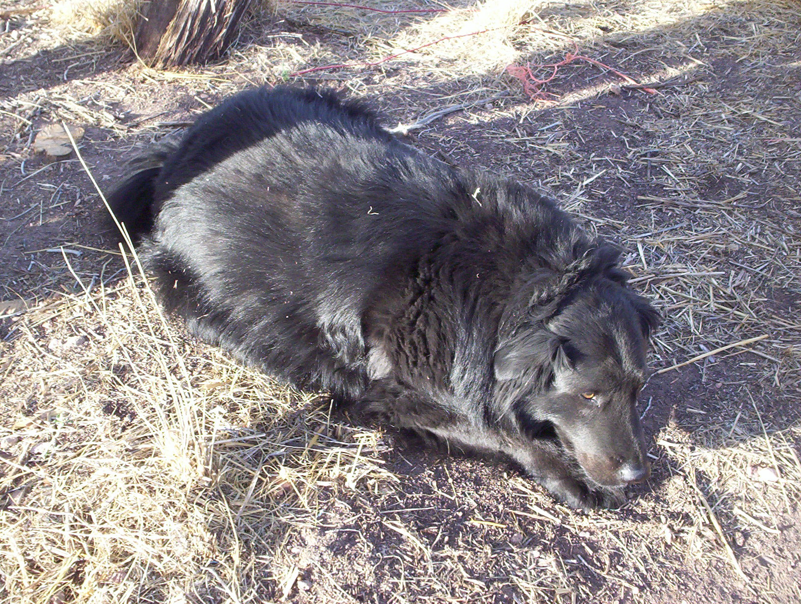 Even though it was technically my fault, he has this one infuriating thing that he does and he chose to do it the moment I grumped down the ladder this morning. He’s connected to his tie-out cable day and night – I just slip it under the door – because once he’s outside and loose he heads for the horizon and absolutely will not listen to any command to return. Oh HOW I wish I’d done more with electronic collars when he was young, but he wouldn’t have been wearing it at this time anyway. Sometimes he comes back, usually he shows up at a neighbor’s hours later. Someday he’s going to kill a calf or something and then there’ll be hell to pay.
