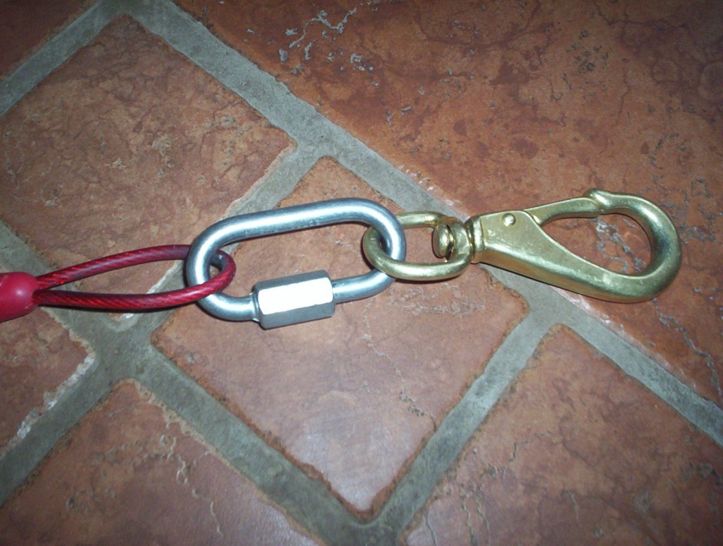 Little Bear has straightened a small quick link right out, pulling the threads apart. I think it’s possible it had come partially unscrewed, but can’t say. He has broken at least three clips right off storebought tie-out cables, which is why I won’t use them anymore. When a cable gets frayed and needs replacement, I cut them off and replace them.